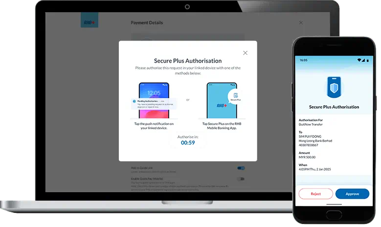 Transition effortlessly and securely between your mobile and browser with the improved RHB Online Banking experience.