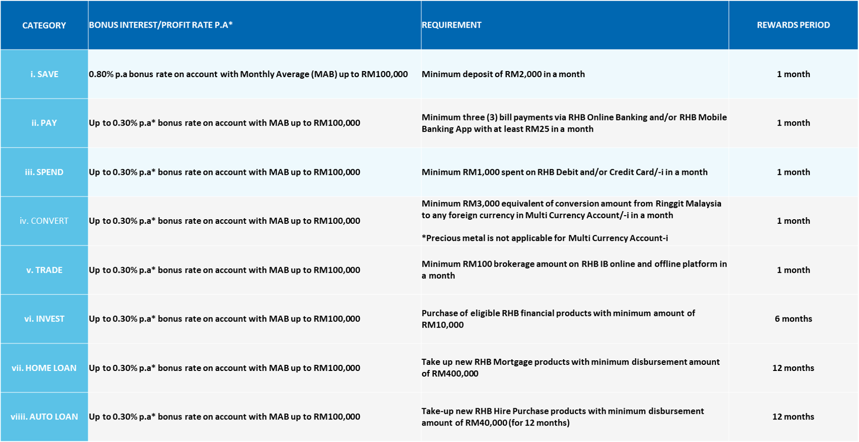 • If there are any retail transactions not reflected in the RHB statement due to any failure, Bonus Rate will not be computed.