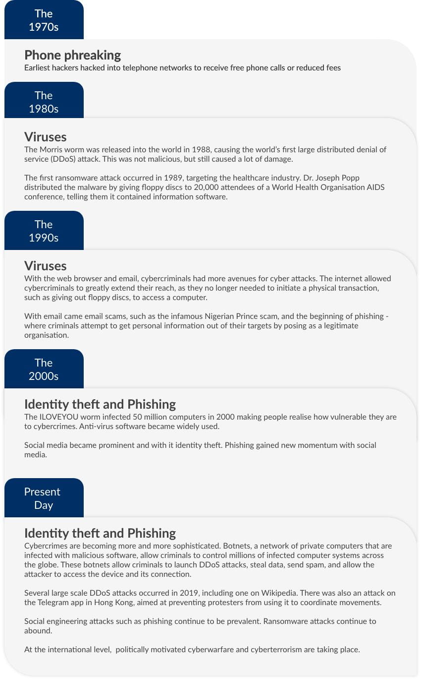 Cybercrimes have their roots in telecommunications and began with phone phreaking, which peaked in the 1970s. It has also evolved with technology, becoming more and more sophisticated.