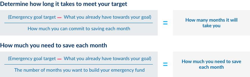 To start saving for retirement or an emergency fund, determine how long it will take to meet your target and how much you need to save each month. Talk to your bank for options on how to start or use the simple calculations below to kick start your savings plan:
