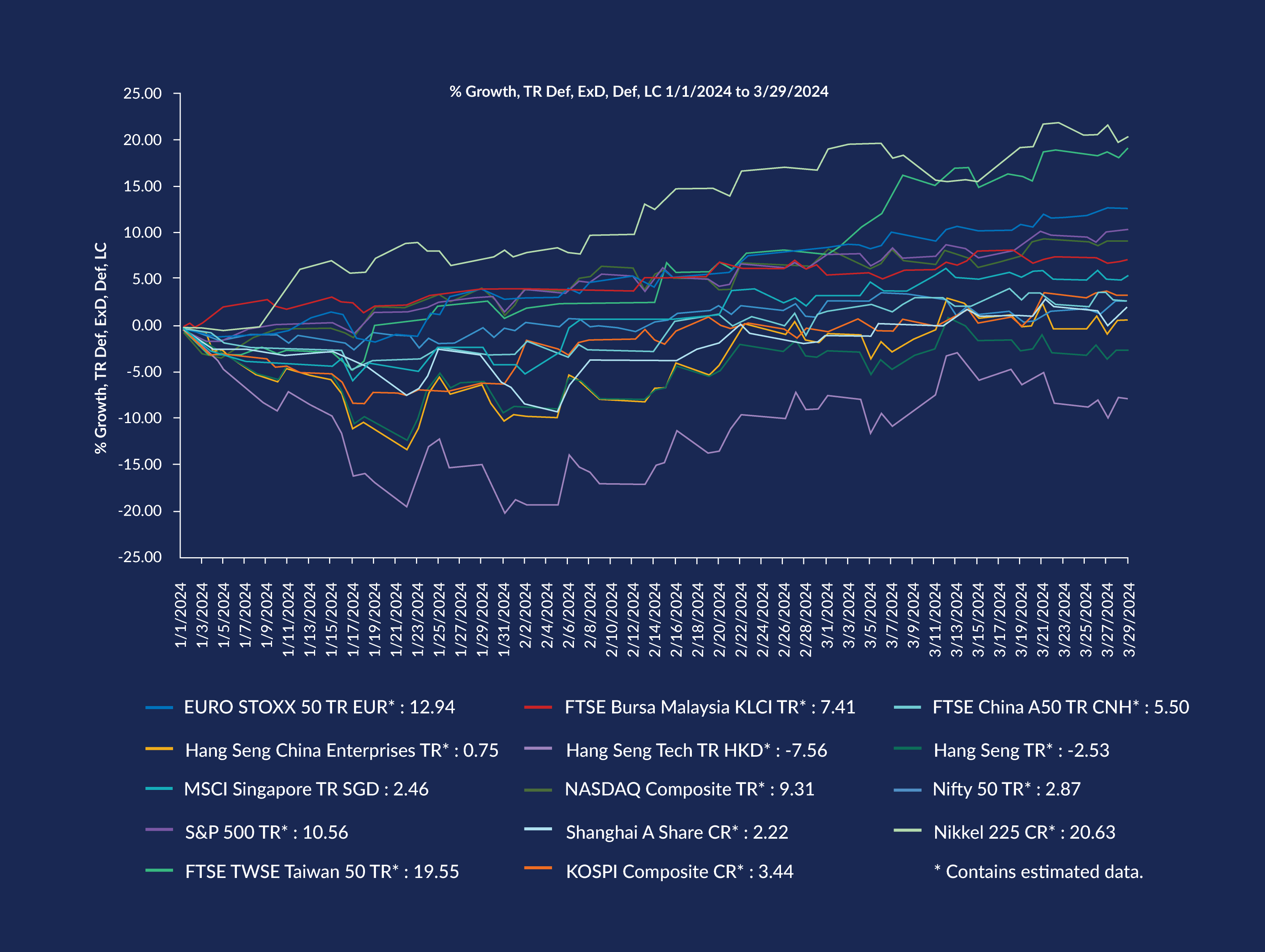 The first quarter of 2024 was a barrel of surprises. The major recession on the tips of our tongues was tactfully avoided, interest/profit rate cuts were pushed back, and the stock markets ended the quarter on a high note. As AI transitioned from buzzword to norm, technology stocks led gains in the equities space, while value stocks also claimed their fair share of attention.