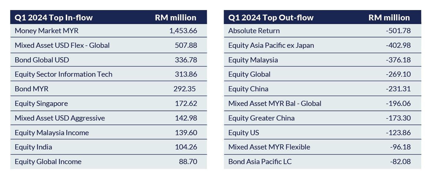 Overall, Chinese equity funds showed support and signs of recovery, buoyed by their better value compared to the rest of the global equity market. Malaysia also proved to be attractive, with the market’s relative stability as its main selling point.