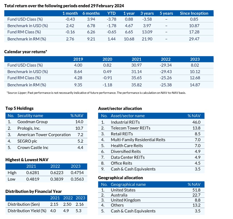 Moving on to the income theme, this fund remains a great option for diversification. Due to the increasing pressure of rate hikes over the past two years, the fund has placed pressure on many income assets. With a pivot in interest/profit rates looming on the horizon, this fund is well-positioned to still provide the opportunity to accumulate income assets for long-term potential growth. REIT holders typically enjoy both the benefits of capital gain from the equity market and income payouts.
