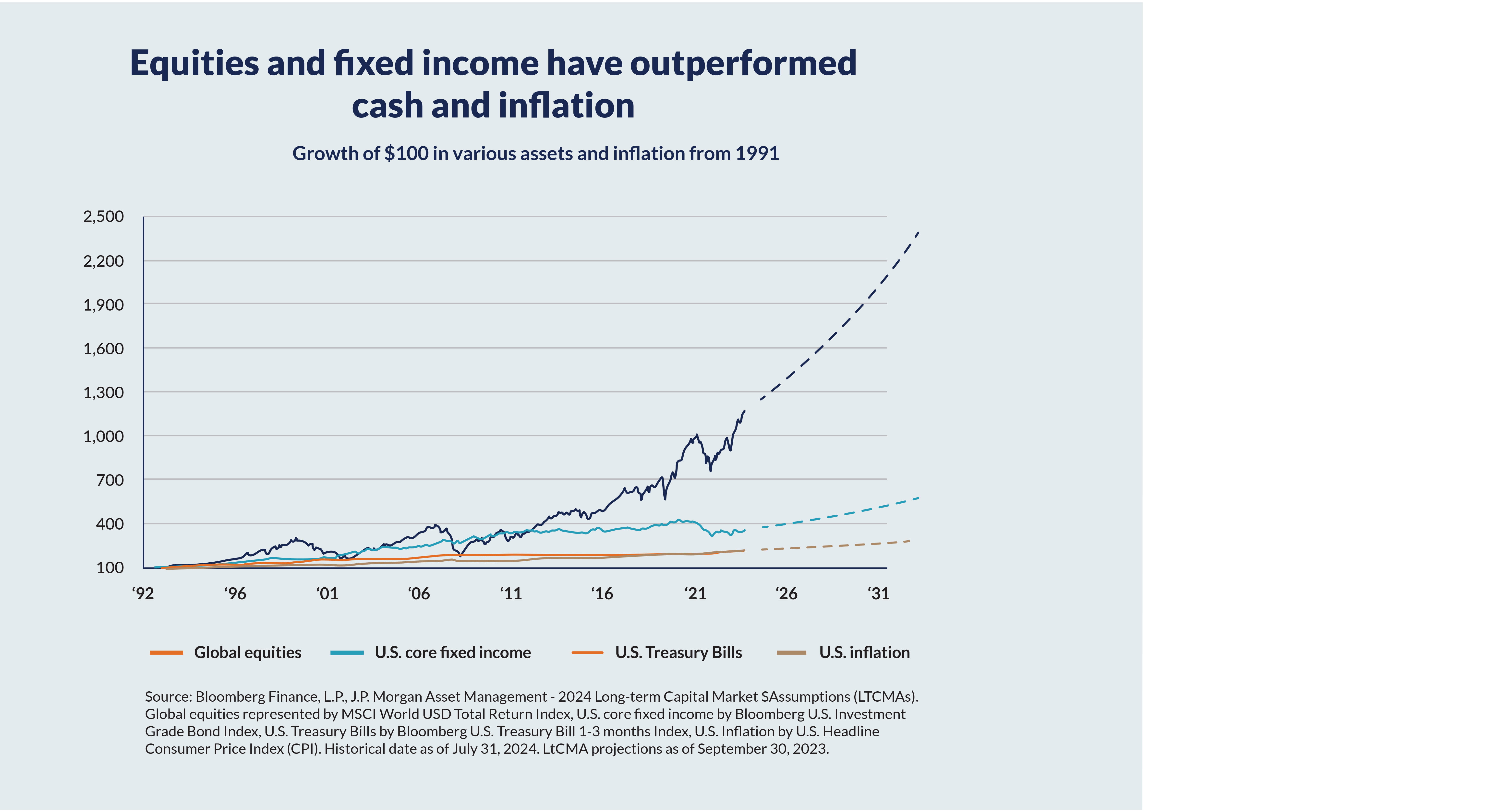 Let’s look at this example showing how equities and fixed income have outperformed cash and inflation, using an initial investment of USD100.