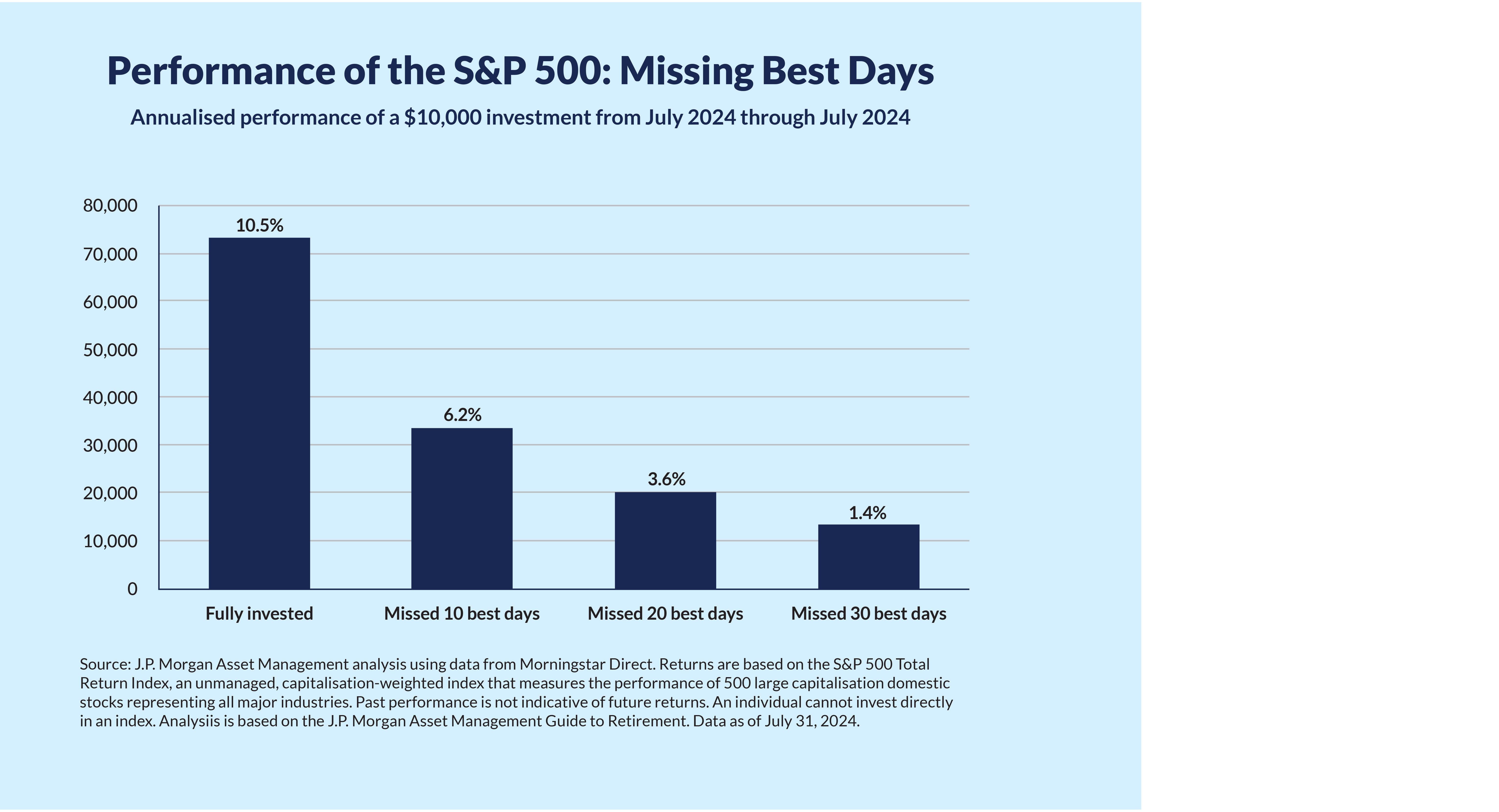 - There’s no such thing as the ‘perfect’ time to invest If we all waited for the ‘perfect’ time, we’d never invest. Small, consistent investments can grow significantly over time. Investing regularly through Dollar-Cost Averaging (DCA), regardless of market conditions, helps reduce the risk of market volatility and ensures that you don’t miss out on long-term gains. This chart shows you the importance of staying invested in the market – even during turbulent times.