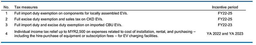 - Exemption from import duty, excise duties, and sales tax for EVs.