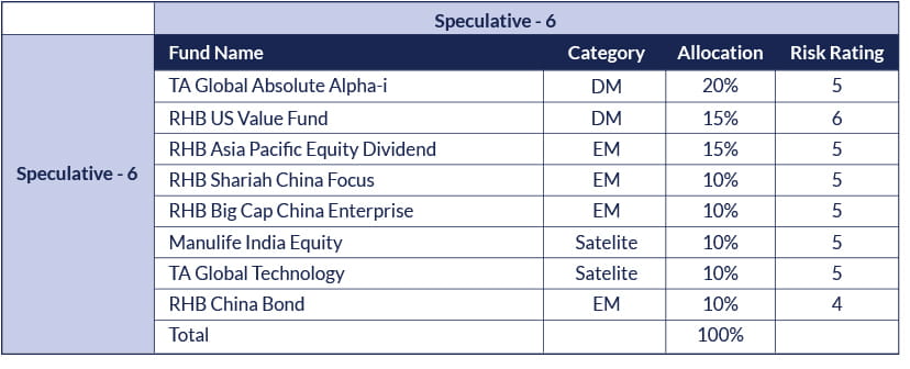 ... and here’s an example of how investments can be allocated among these funds in a well-diversified portfolio based on the investor’s risk profile: