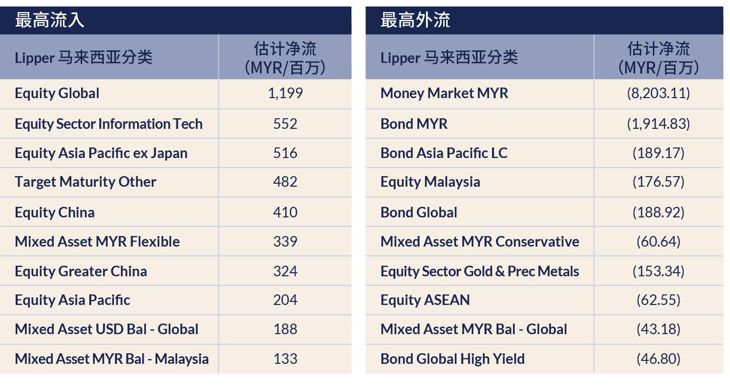 就地域而言,亚太和中国股票基金的流入量最高。另一方面,东盟和马来西亚的资金外流则最为严重。