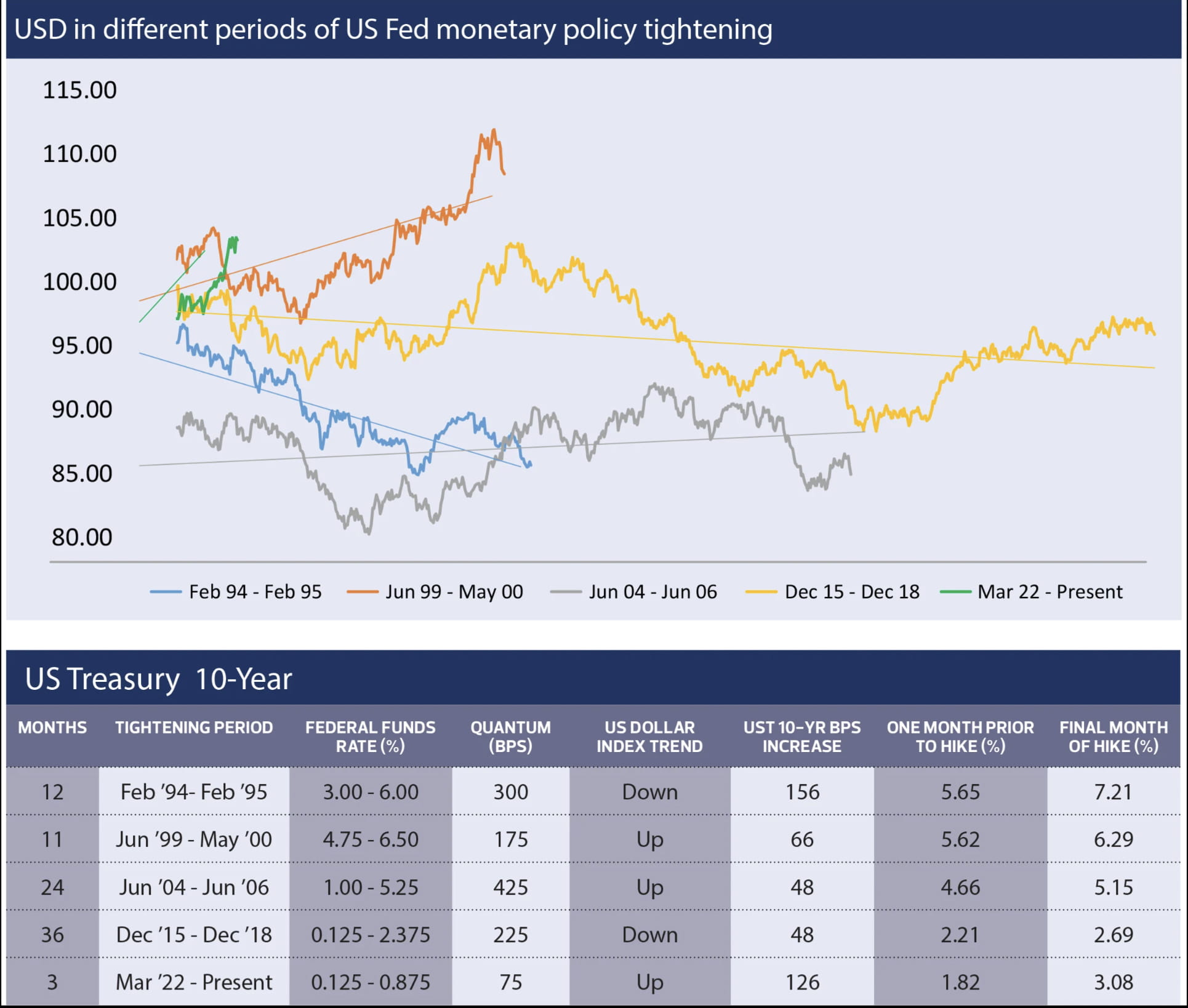 For the US dollar (USD), a pattern of monetary policy tightening that is short and sharp, as in June 1999-May 2000, would suggest the USD is near its peak. The risk is the strength of the USD will come off beyond the July period. Thus, the current market pricing would need to be calibrated eventually to unwind the excessive tightening that is being priced via the USD. This will eventually give regional Asian currencies, particularly the USD/MYR (Malaysian ringgit), leeway for a change in directional trend from its current upward trajectory.