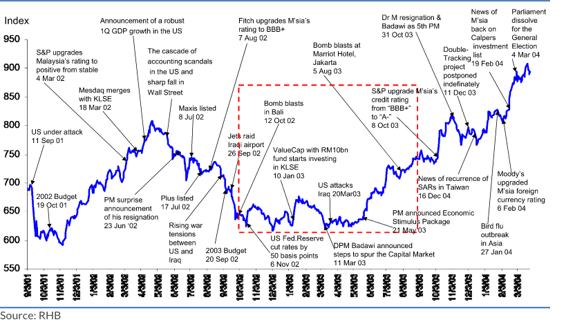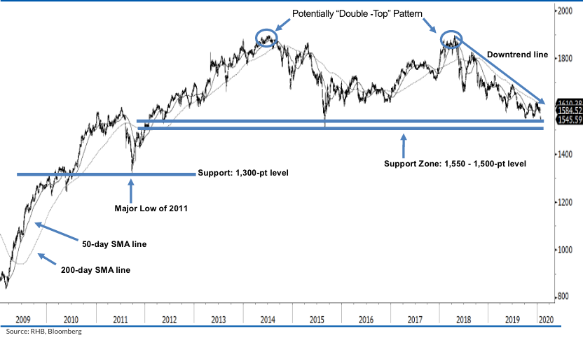 Market trends remain decidedly bearish, with a “Double Top” pattern forming and the FBM KLCI is currently in the key support zone between 1,500-1,550 pts. A breakdown below this should see the next support at 1,300 pts, while the upside resistance is at 1,600 pts.