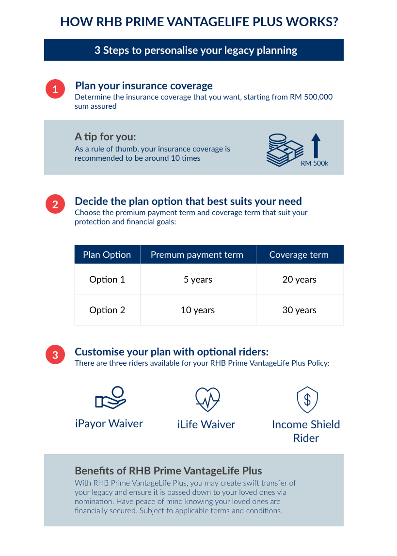 As life insurance is a risk transfer tool, an individual may pay a risk premium in exchange for a larger amount of protection. For example, a 40-year-old businessman who is a non-smoker may take up the RHB Prime VantageLife Plus policy with RM1 million coverage for 30 years by paying a limited premium of RM25,000 for only 10 years.