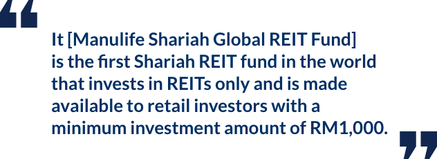 One way investors can capture this opportunity is to invest in the Manulife Shariah Global REIT Fund. Launched in March, it is the first Shariah REIT fund in the world that invests in REITs only and is made available to retail investors with a minimum investment amount of RM1,000.