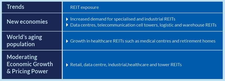 Technology and the needs of the population have pushed change across the global economy, including how we view property as an asset. Investing in global REITs like Manulife Shariah Global REIT can offer you exposure (more than 50% as of December 2023) to emerging trends that support long-term growth.