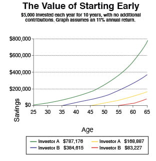 Millennials also start saving for retirement later as many graduate with student debt. They are also getting married and having children later. This affects retirement savings as many people feel that they have to save for a house and family before saving for retirement. As a result, young people lose their biggest retirement savings advantage, which is time. Time is your best friend, as shown below.