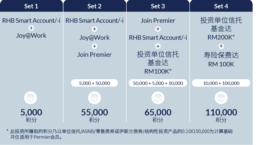 比如,新开设的RHB Smart Account-/i户口,能为您赚取3,000 RHB Loyalty积分。可是,若您同时开设RHB Joy@Work工资转账户口,则可获享高达5,000 RHB Loyalty积分。