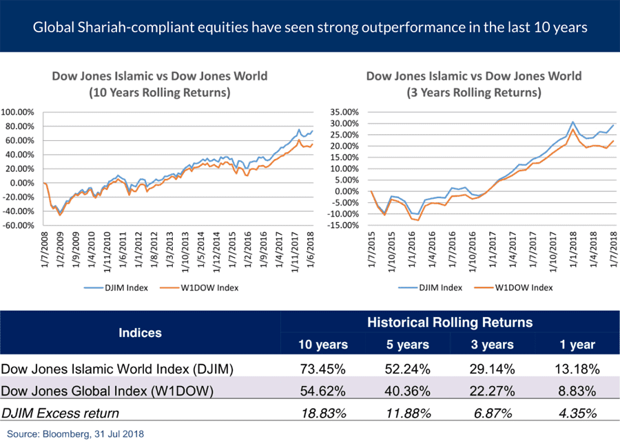Global shariah equities have seen strong outperformance over the past decade, evident in the performance of the Dow Jones Islamic World Index (DJIM) and its conventional counterpart, the Dow Jones Global Index (W1DOW).