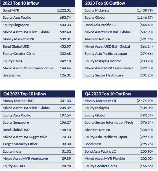 The ringgit’s persistent weakness against the US dollar throughout the year led to the influx of US dollar denominated funds. This migration was also reflected in Malaysian equities, which saw the most significant outflow among equity funds in 2023. This was not unique to Malaysian equities, however, as there was also considerable outflow across global equities, information technology, absolute return, and Asia Pacific ex-Japan strategies. The outflow effect spilled over into other equity-related funds focusing on Japan, Singapore, India, and the ASEAN region.