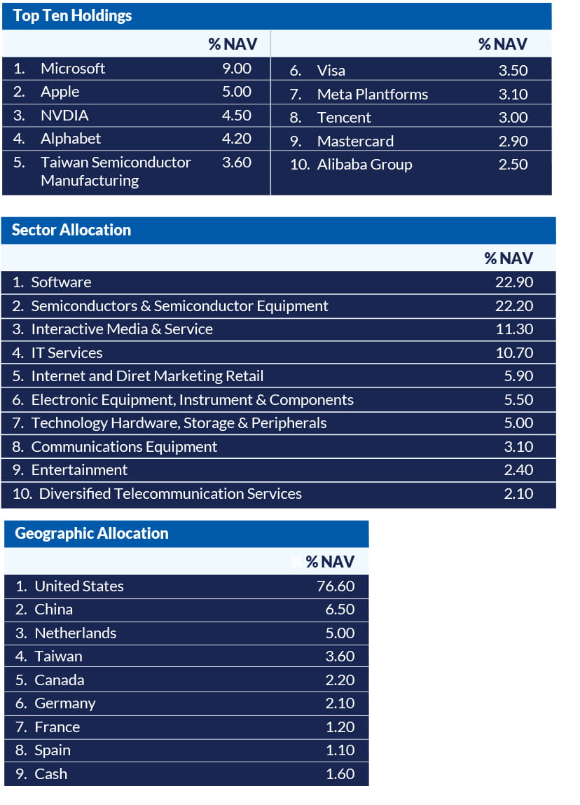 This fund aims for long-term capital appreciation through a globally diversified portfolio of mega cap technology stocks, with a focus on the US equity market.