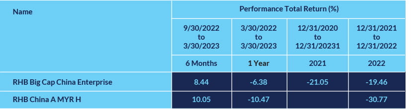 Source: RHB Big Cap China Enterprise (March 2023) and RHB China A (February 2023)