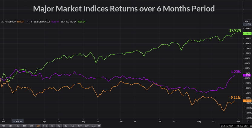 The chart below shows how markets have performed over a six-month period. The global equities market, for which the S&P 500 is often used as an indicator, shows an increase of 17.93%. The local market, represented by the FTSE Bursa Malaysia KLCI, showed a relatively flat return of 1.25%. Meanwhile, the MSCI Asia Pacific Index (ex-Japan) dipped by 9.11% during the same period.