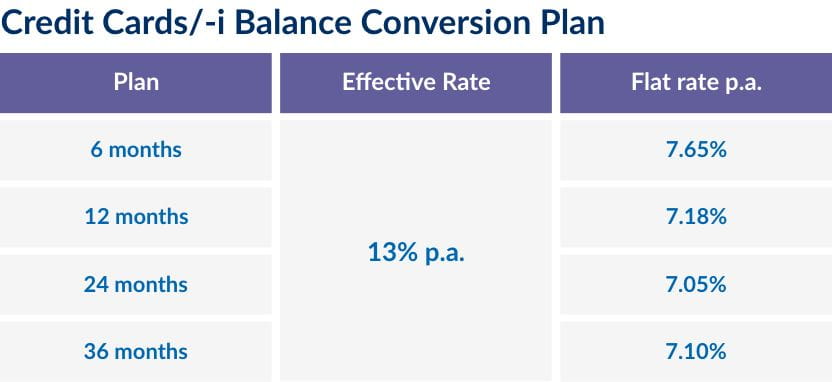 For credit cards/-i, RHB is offering a Credit Card Balance Conversion programme to convert the outstanding balance into an instalment plan of not more than three (3) years, at an effective rate of not more than 13% per annum.