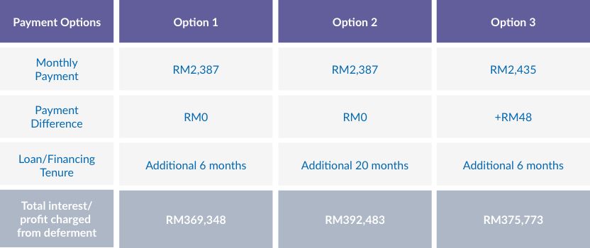 Pay a higher monthly payment from October 2020 onwards to accommodate the deferred interest/profit payment. This is the best option. You are effectively paying both principal + original interest/profit and deferred period interest/profit, and the total interest/profit charged for the remaining tenure will be lower. The new monthly payment amount will be RM2,435 – just RM48 more than your old monthly payment amount. Effectively, you end up paying only RM6,425 additional interest/profit payments compared with method 1.