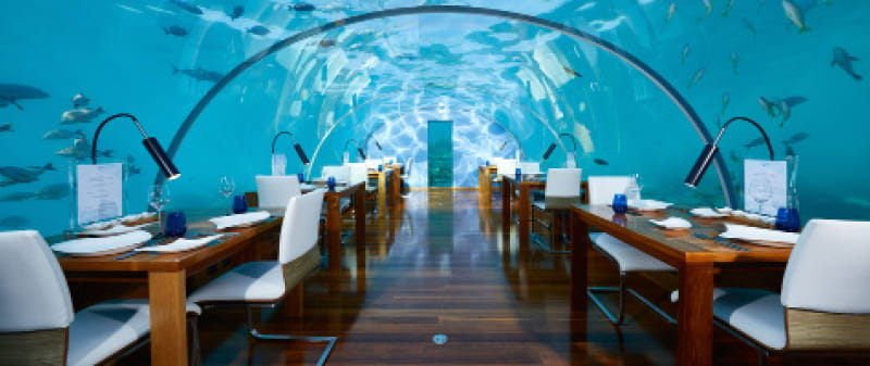 马尔代夫无疑是海滩度假的首选地,一直都是无数旅游刊物的首推地点,不止是因为极其美丽的大自然景色,还有最为壮观的度假村级餐厅,可以更好的展示海洋风光,当中最令人叹为观止的则是坐落在伦格里岛康莱德酒店的海底别墅The Muraka。