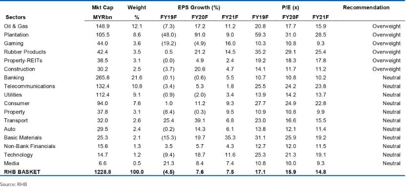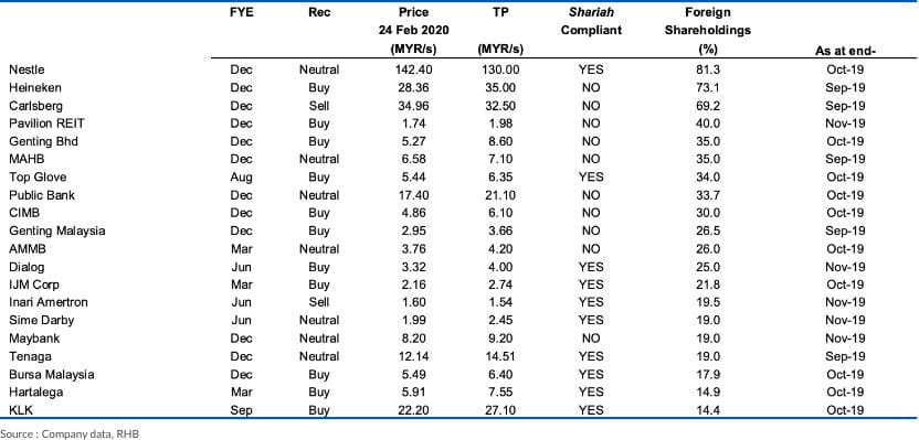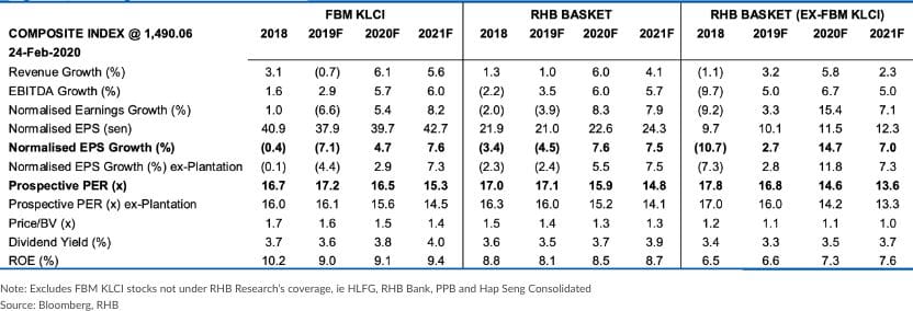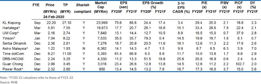 • Risky business. The elevated risks and uncertainty mean that, in the near term, the priority for equity investors should be the preservation of capital, with core holdings in defensive and resilient high-yield stocks. The duration of this strategy depends on political stability returning and evidence of COVID19 being successfully contained. Further out, investors also need to begin positioning for a cyclical recovery. This involves gradually accumulating stocks in the cyclical banks, oil & gas, construction, plantations, gaming and rubber products sectors. The recent developments prompt us to cut our end2020 FBM KLCI target to 1,600 pts (from 1,700 pts) after ascribing a 16.5x (from 17.5x) PE to forward earnings.