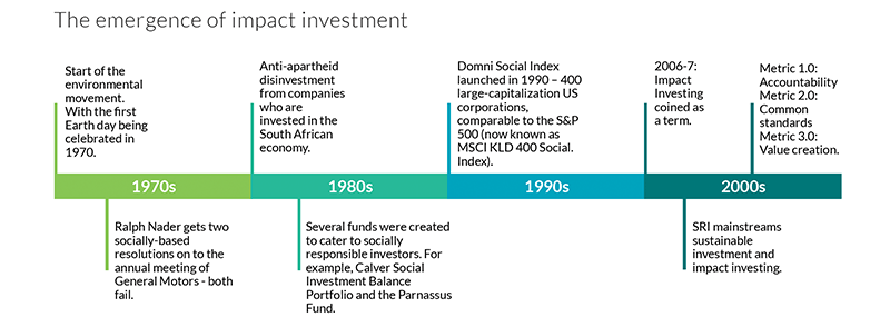 ESG has its roots in socially responsible investing (SRI) which relies on strategies that emphasise sustainable, responsible and impact investing. SRI sprung from a niche investment strategy that emerged in the 1960s and '70s, but some might say it goes further back, to the Quaker, Islamic and Jewish exclusion of “sinful” companies. The apartheid in South Africa became a tipping point, when investors began divesting from companies that did business there on moral and ethical grounds, refusing to invest in a government that implemented a system of institutionalised racial segregation.