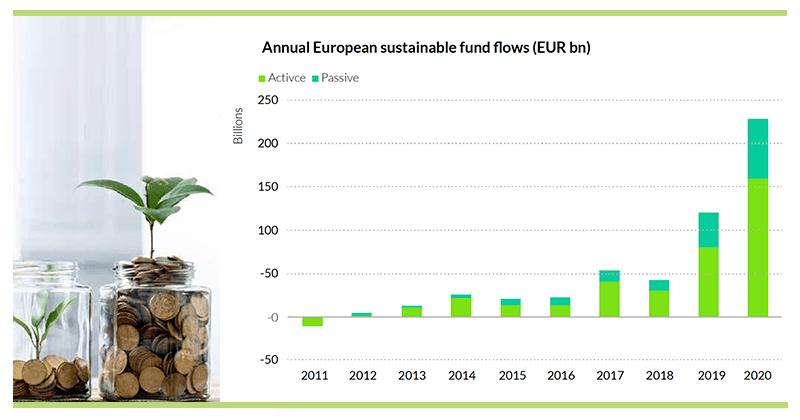 Due to its appeal, momentum is fast building up behind ESG investing. Global sustainable funds saw inflows of US$45.7 billion (Q1 2020), while the broader fund universe had an outflow of US$384.7 billion. Morningstar reported a bumper year for ESG funds in 2020. During the year, sustainable open-end and exchange-traded funds (ETFs) attracted net inflows of US$278.7 billion. This was almost double the figure for 2019. In the fourth quarter alone, sustainable funds pulled close to US$119.6 billion in net new money, taking 45% of overall European funds flows.