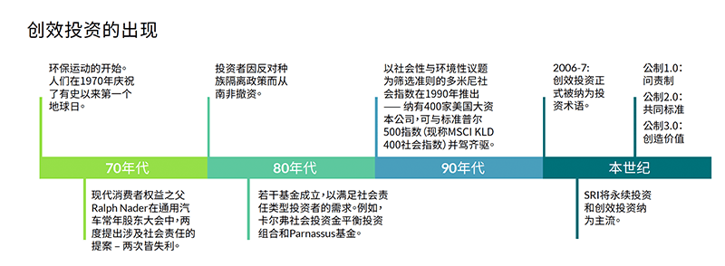 ESG的根源在于社会责任投资(SRI),强调可持续发展、负责任和具有社会影响力的投资战略。 SRI源于上世纪60年代和70年代所出现的利基投资战略,但也有人说它可追溯至贵格会教徒、伊斯兰和犹太人排斥 “罪恶”公司的远久年代。