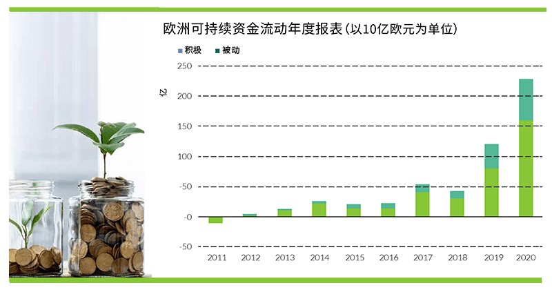 由于深具吸引力,ESG背后的投资势 头正在迅速壮大。对比全球整体基金3,847亿美元的净流出,在2020年首季,全球可持续基金依然录得457亿 美元的净流入。 Morningstar(晨星研报)称,2020年乃ESG基金的丰收年。 在这一年,可持续交易型开放式指数 基金(ETFs)吸引了2,782亿美元的净流入。 这数据几乎是2019年的两 倍。单是在该年第4季度,可持续基金 便有几近1,196亿美元新资金的净流 入,占欧洲资金流动总额的45%。