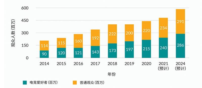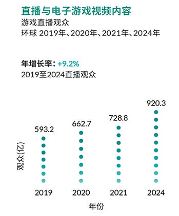 2020年直播所吸引的观众有6.627亿,预计到2024年将达到9.203亿的天文数字。鉴于直播所带来的新展,Newzoo将其年度全球电竞市场报告,更进一步的扩大至2021年的《全球电竞和直播市场报告》。