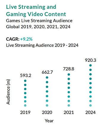 Live streaming had an audience of 662.7 million in 2020 and this audience is expected to grow to 920.3 million in 2024. In light of the new developments in live streaming, Newzoo has expanded its annual Global Esports Market Report into the Global Esport and Live Streaming Market Report in 2021.