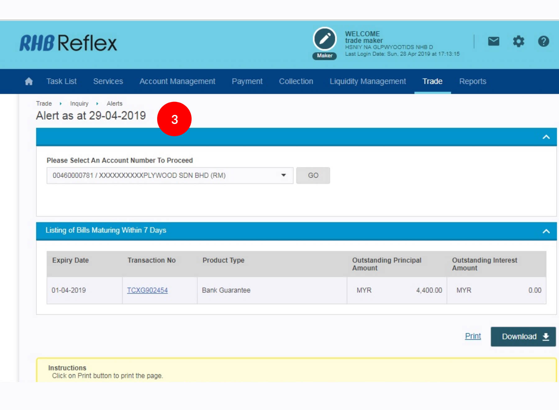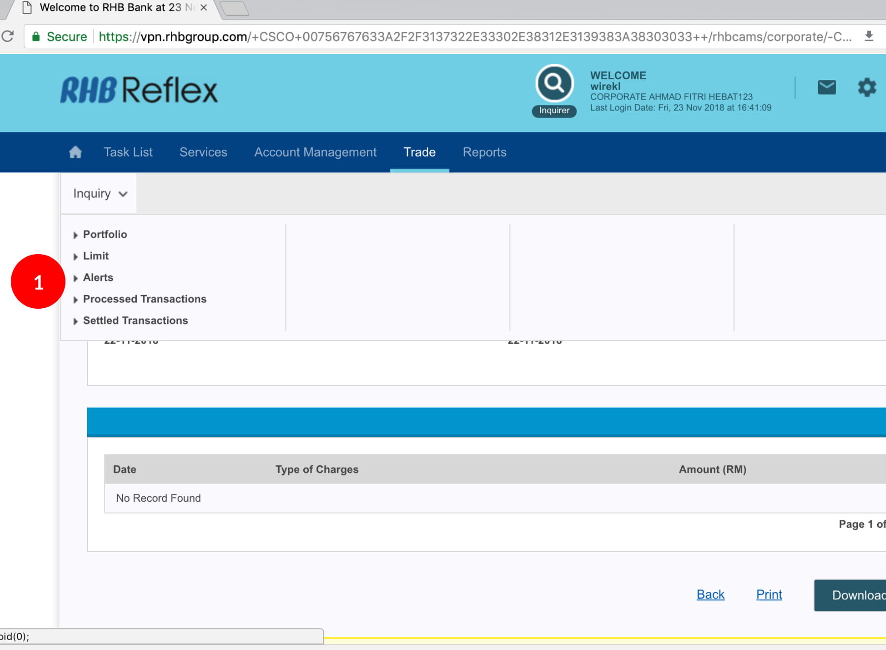 1.Login as User. From the Main Menu bar, click “Trade”, then click “Inquiry” and click “Alerts”.