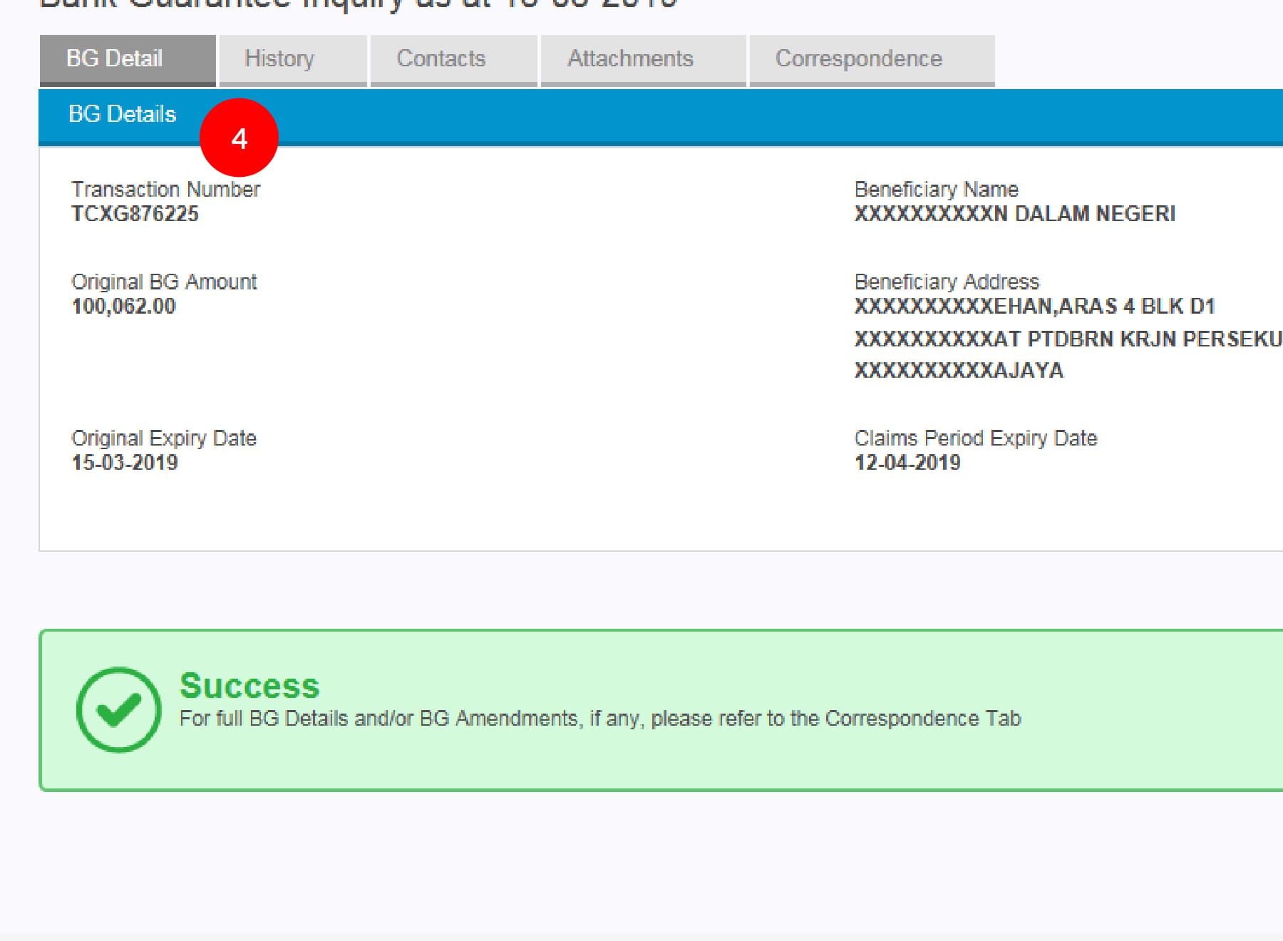 4.Click the hyperlink at transaction number. The system routes the request to the transaction details page, where user can view the details, history, contacts, attachment and correspondence related to the transaction.