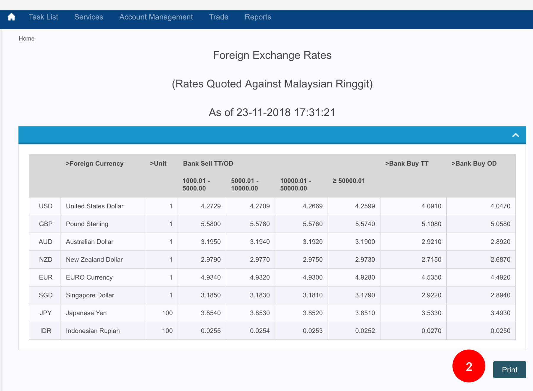 Consists the indicative exchange rates for USD, GBP, AUD, NZD, CAD, GSD, JPY, CHF, CNY, IDR, and EUR in unit for selling and buying.