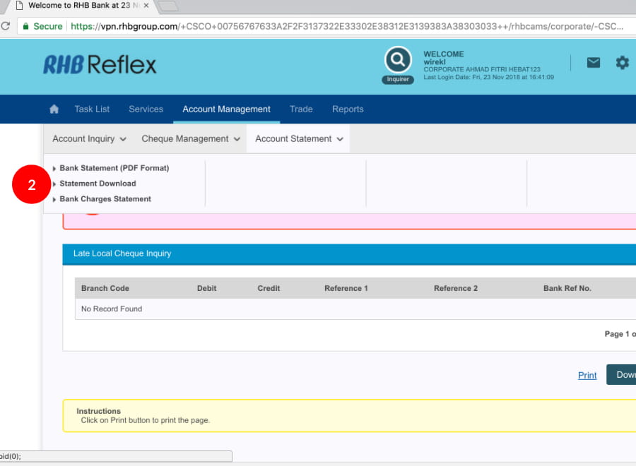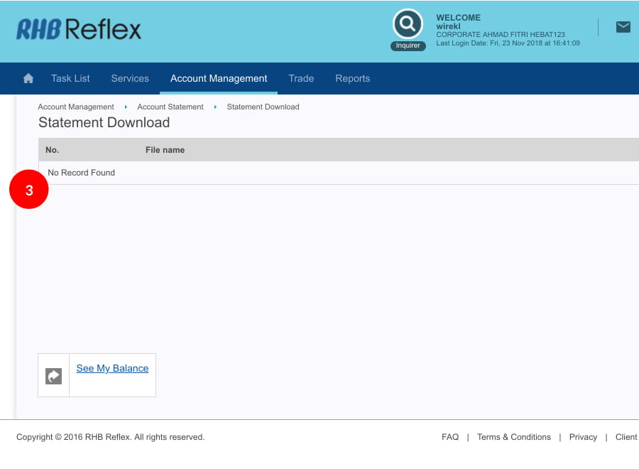 1.Login as User and under “Account Management” tab; select “Account Statement”.