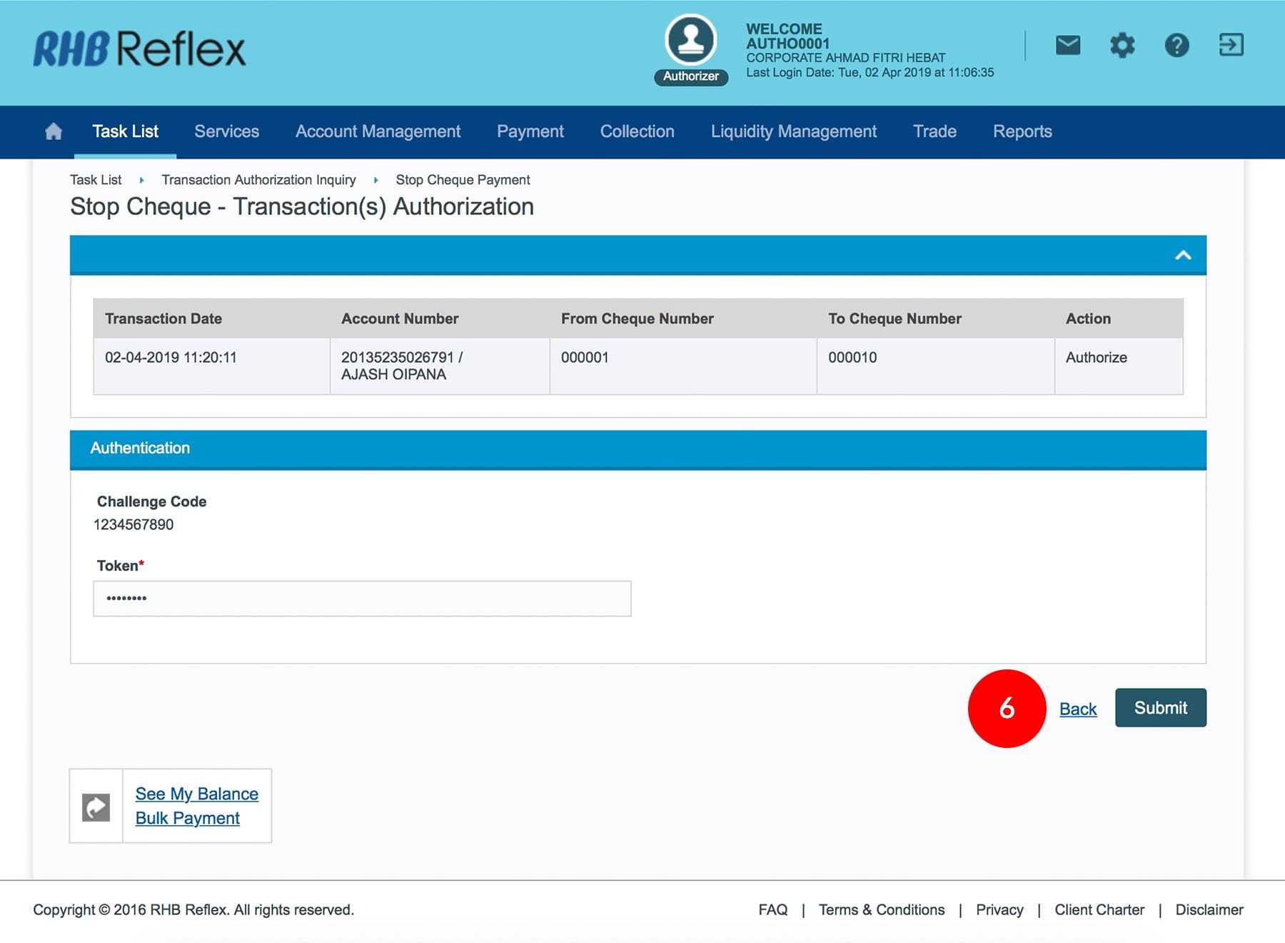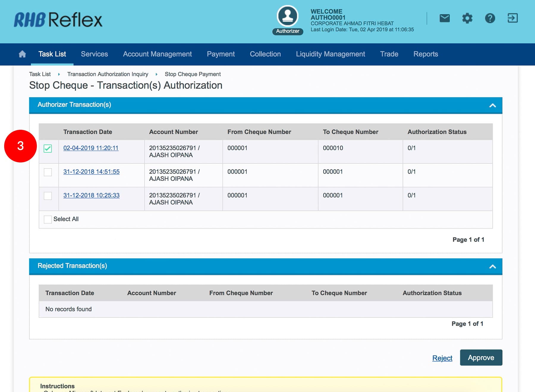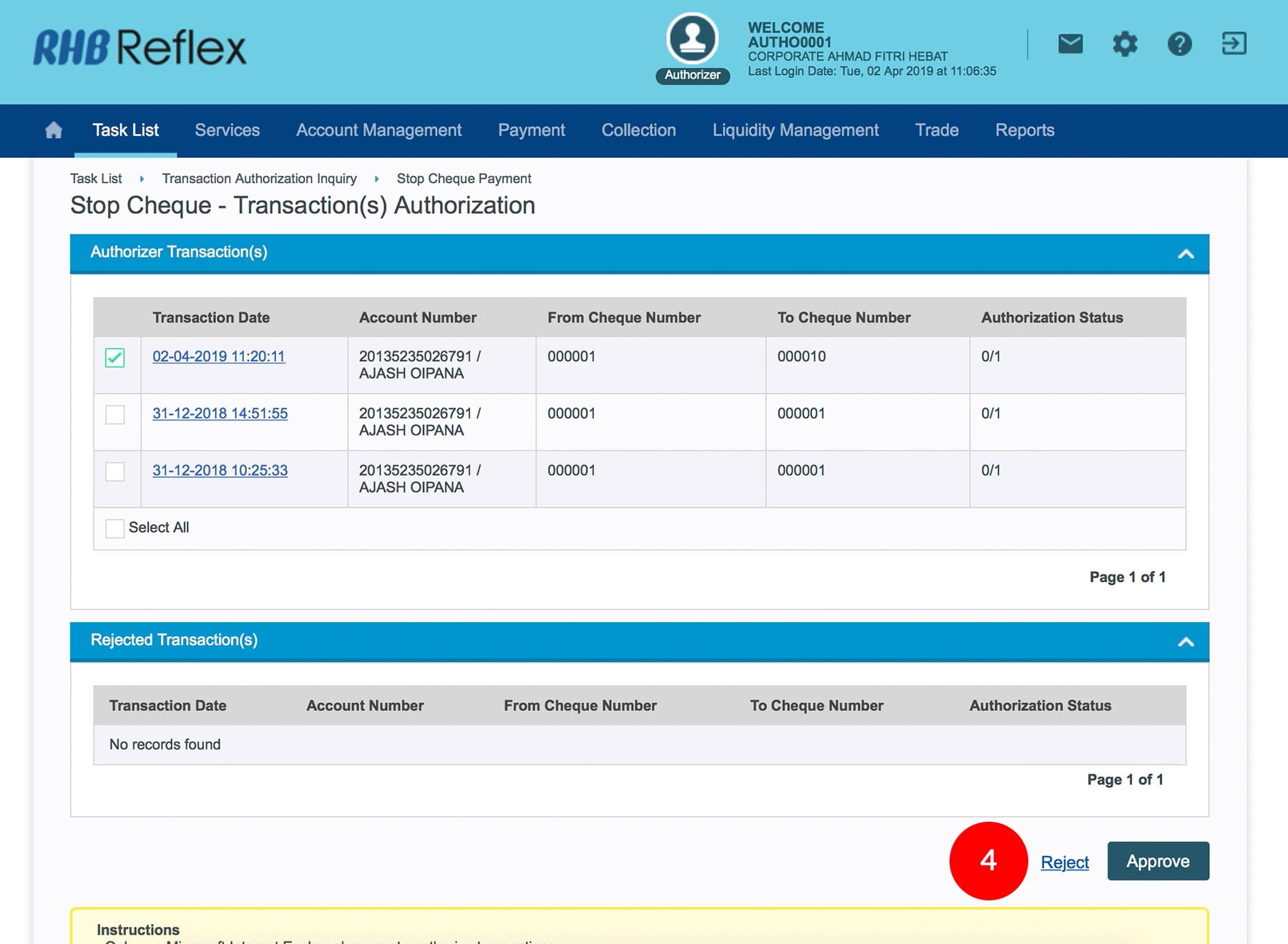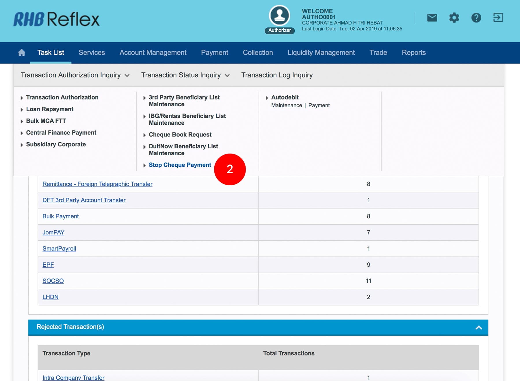 1.Login as User Reviewer / Authorizer and under “Task List”; select “Transaction Authorization Inquiry”.