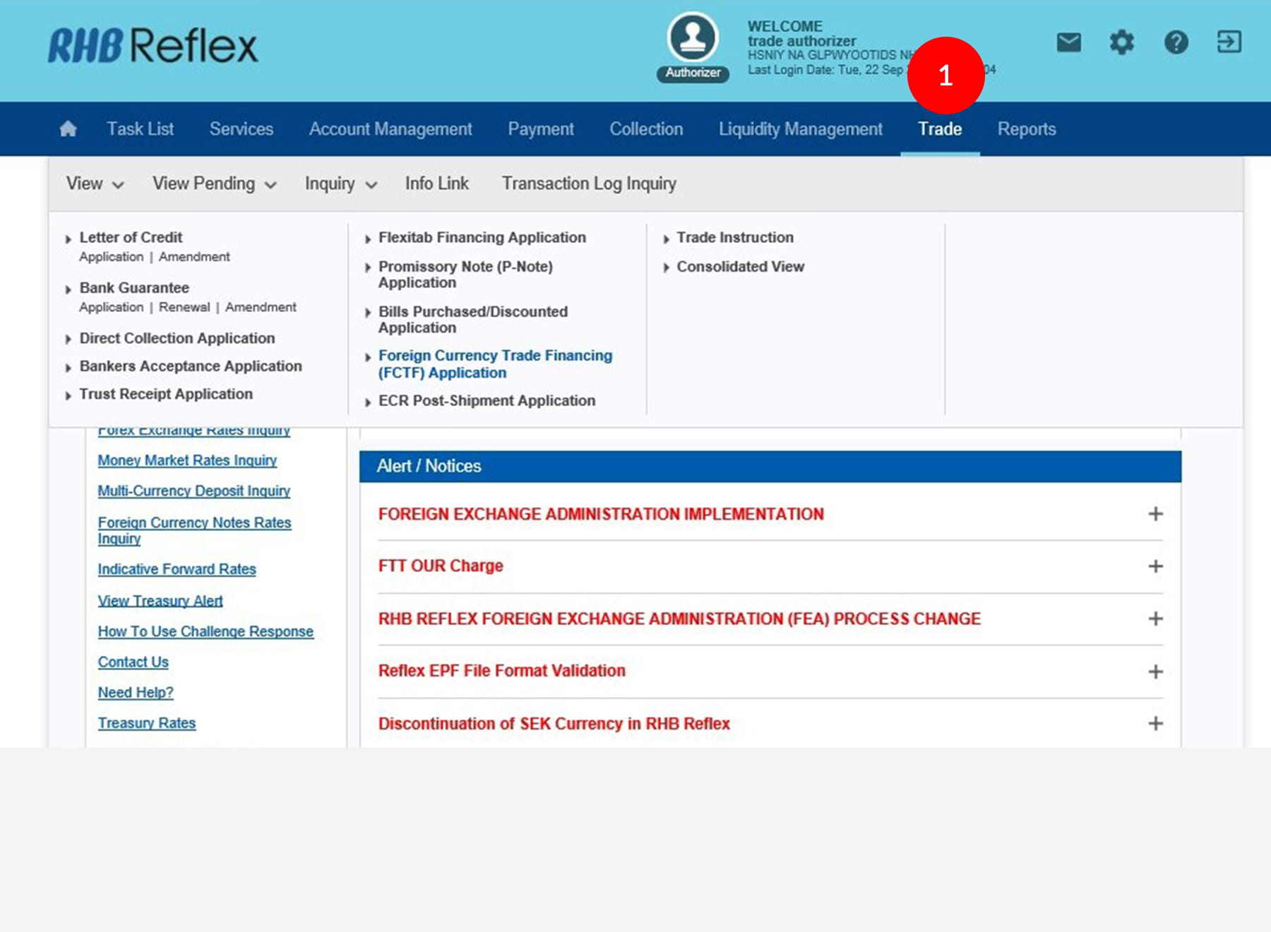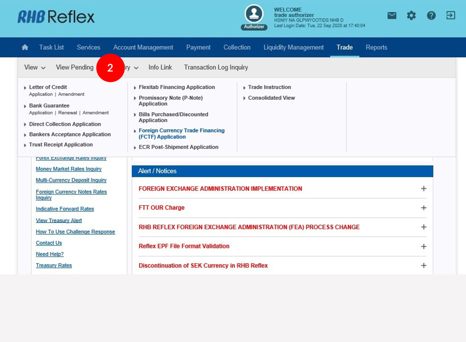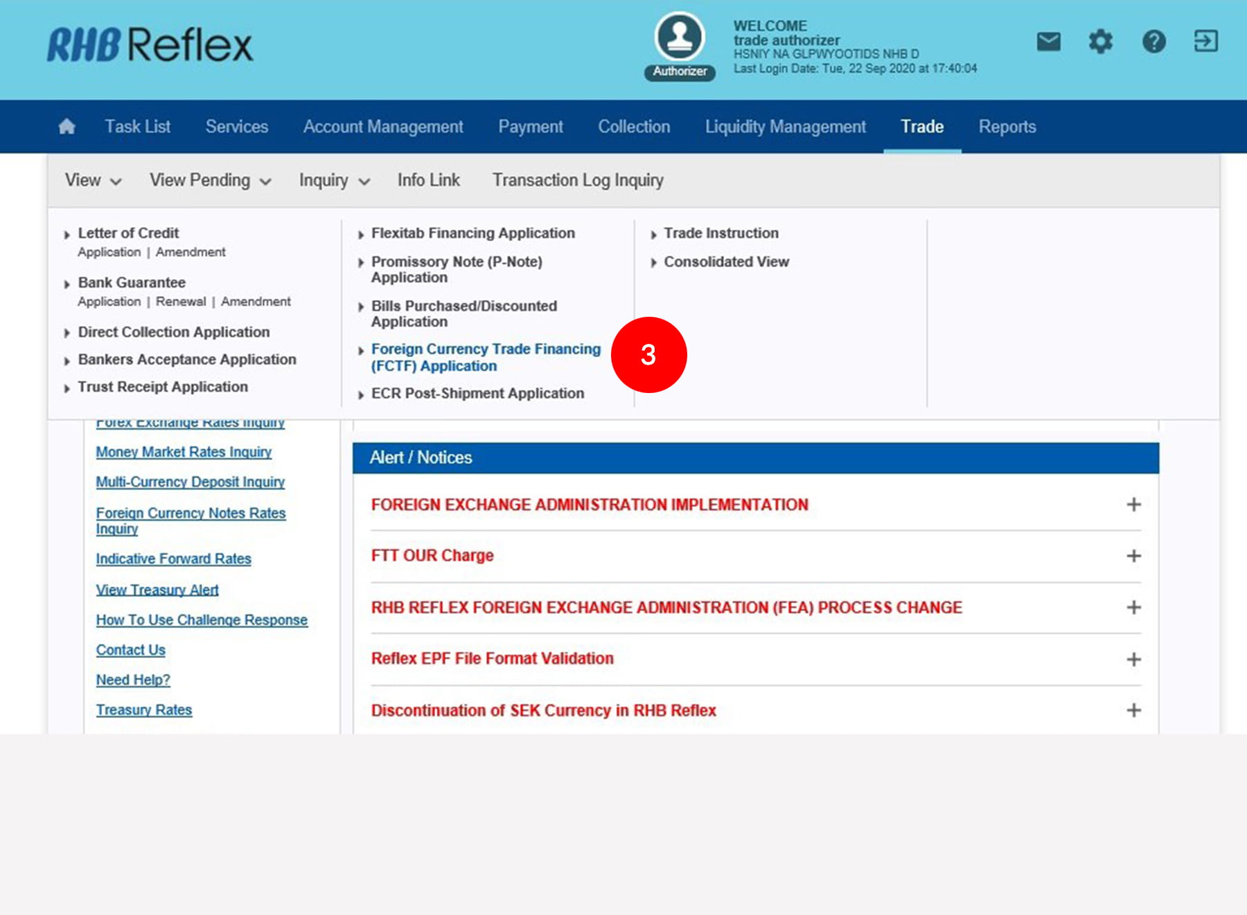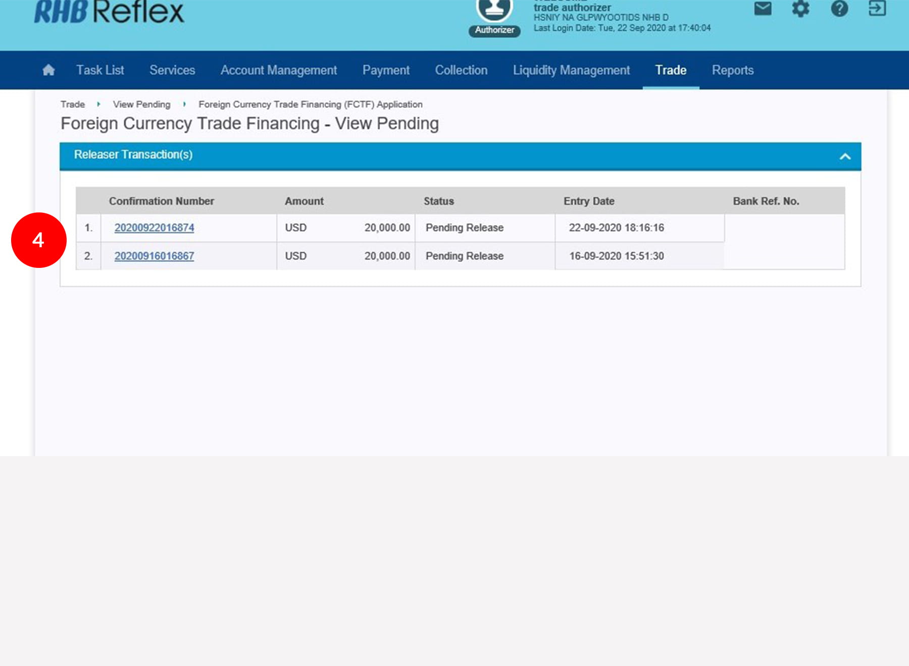 3.Then click on the Foreign Currency Trade Financing (FCTF) Application, which displays a list of applications with Releaser Transactions.
