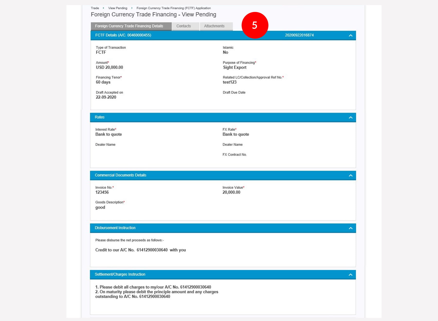 5.On the Details Page, review the data input details, contact and attachments via respective FCTF Details Tab, Contact Tab and Attachments Tab.