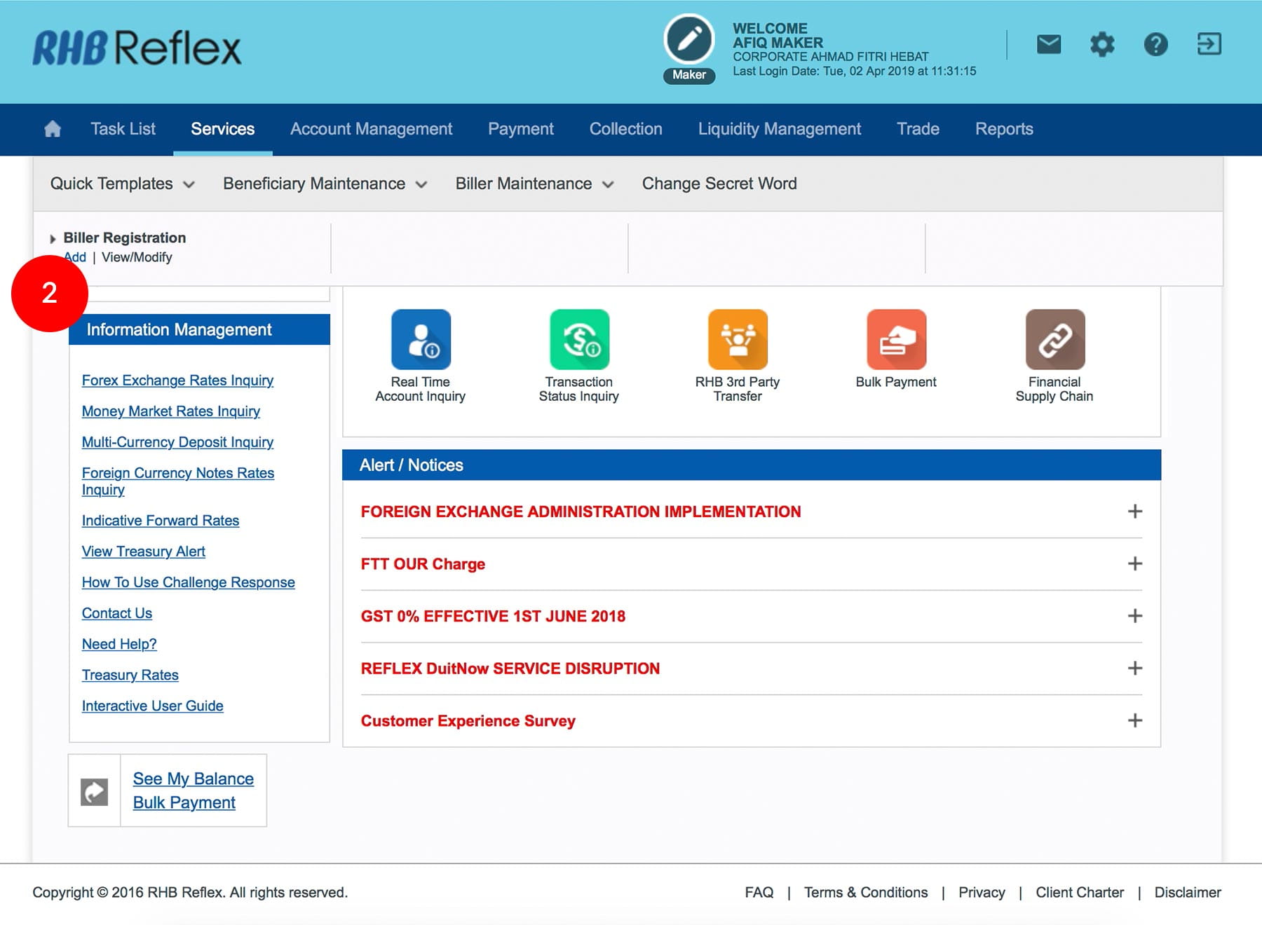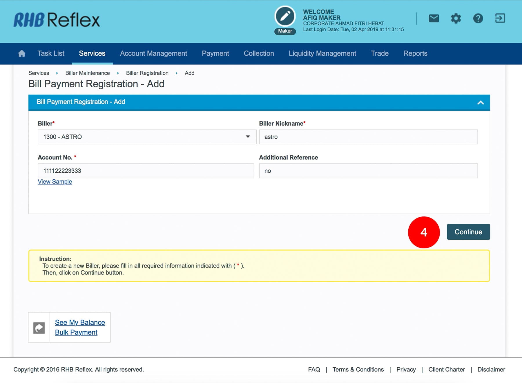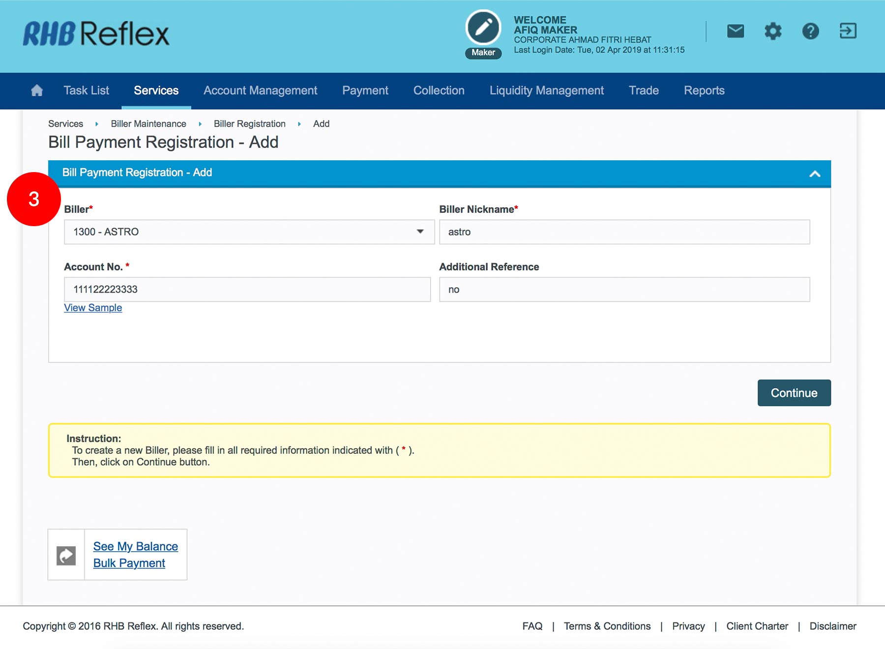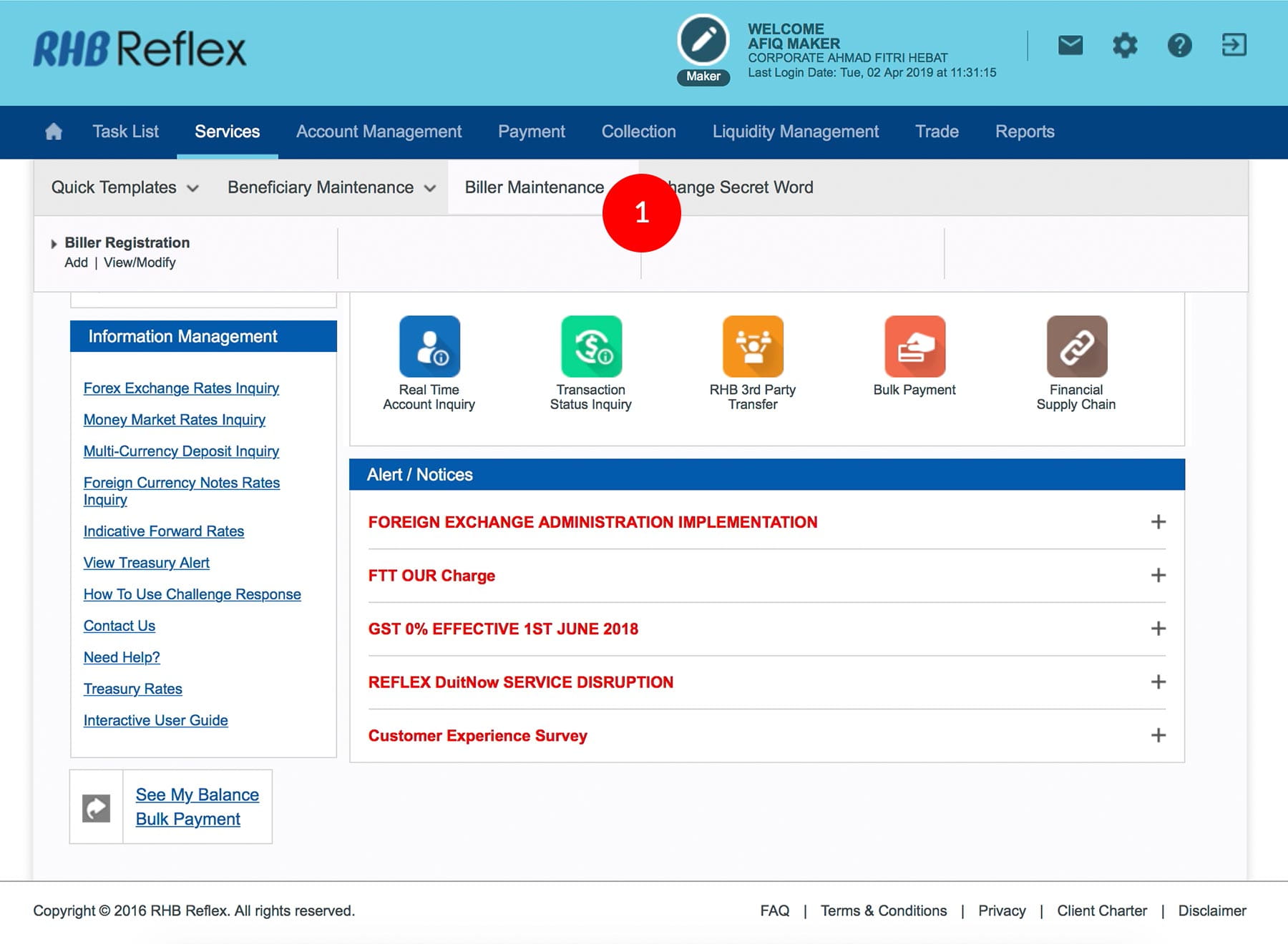 1.Login as User Data Entry and under “Services” tab; select “Biller Maintenance”