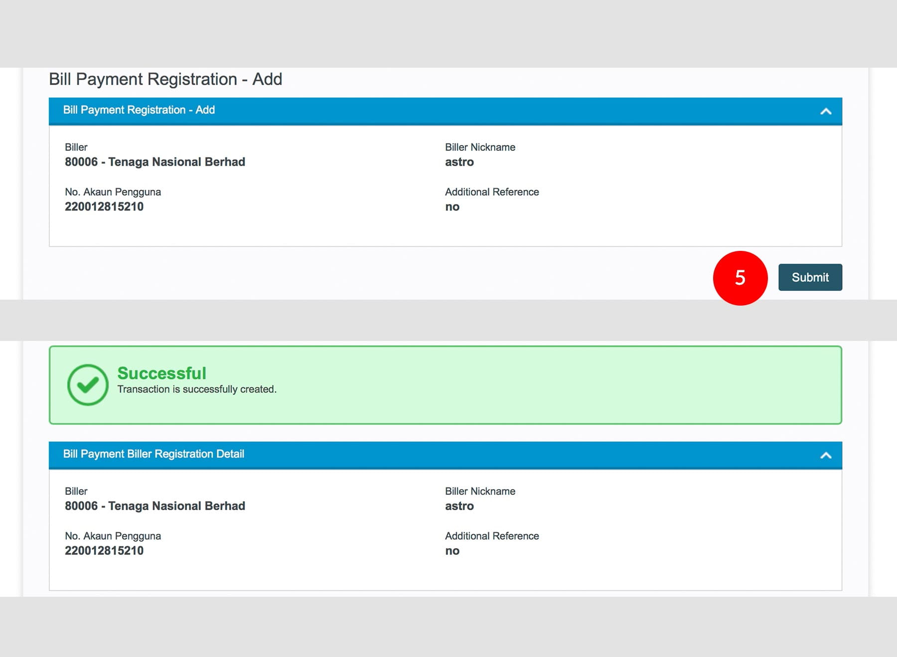 3.Select Biller Type from the drop down menu, key in the Biller Nickname (i.e.: Telekom 1), Account Number of the Bill, (Optional) Additional Reference.