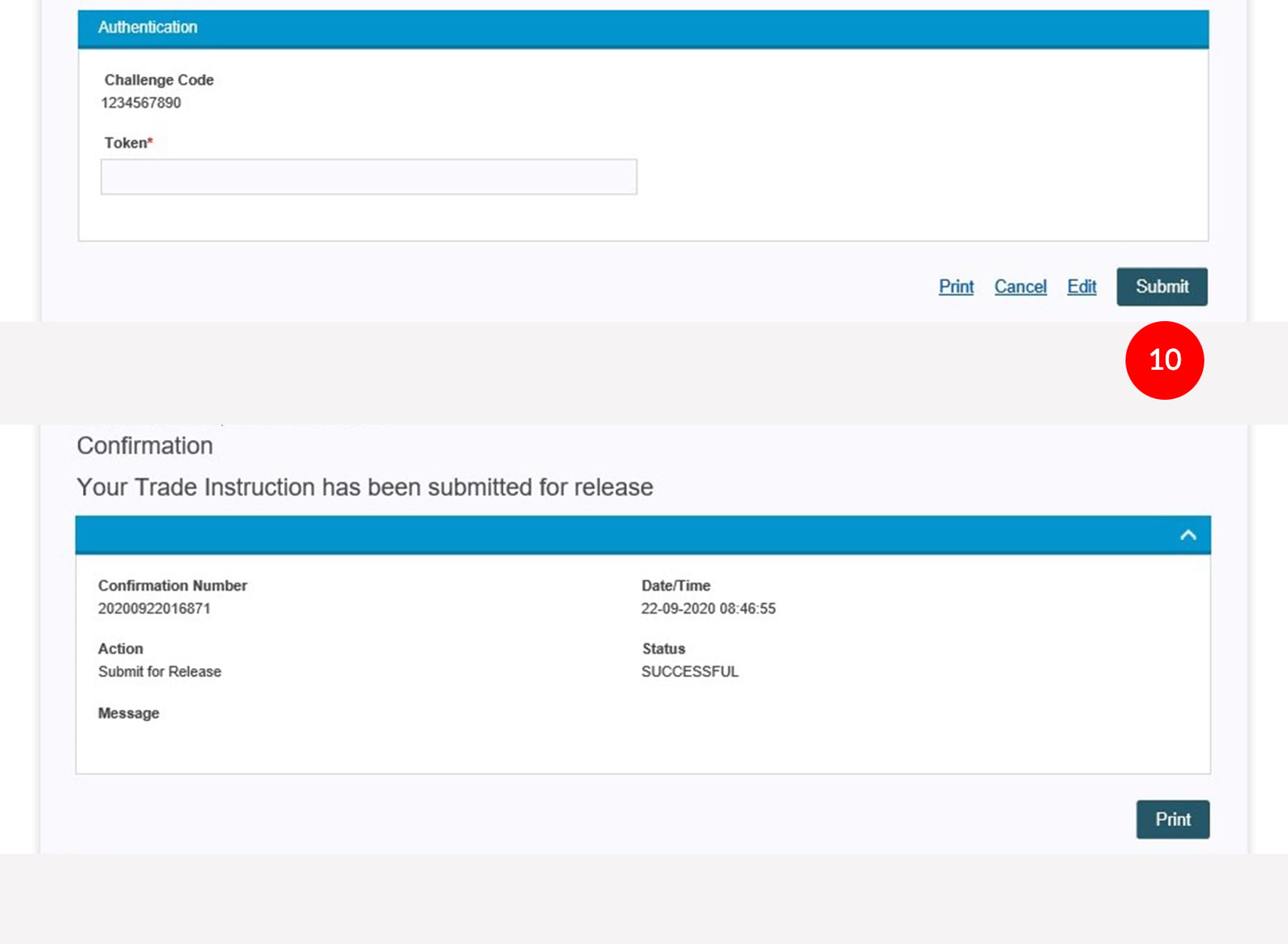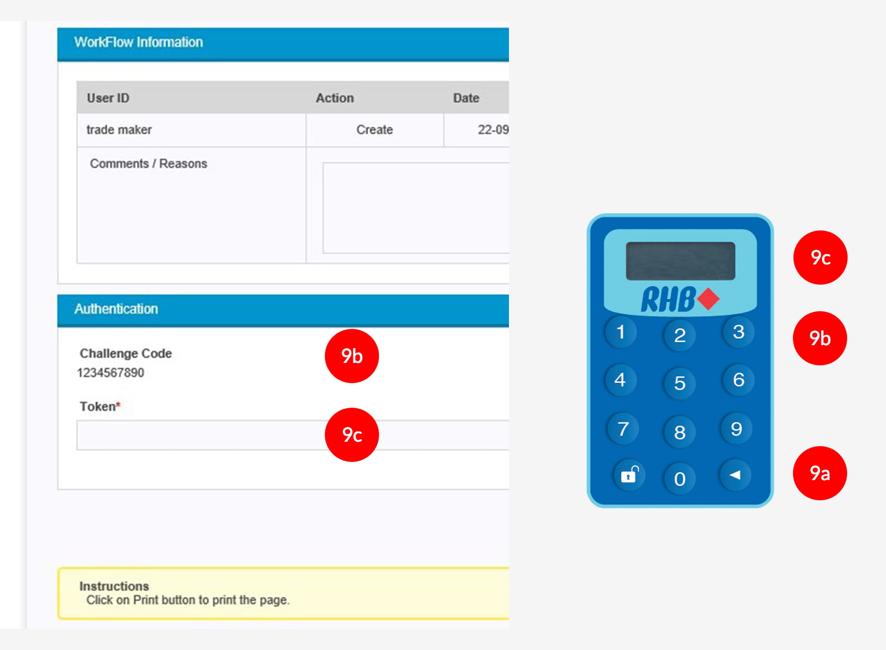 9.Before Maker can submit for Authorizer to approve, system will show Challenge Code and require Token Passcode to be keyed in to be able to submit. To authenticate your transaction, please refer to steps below: