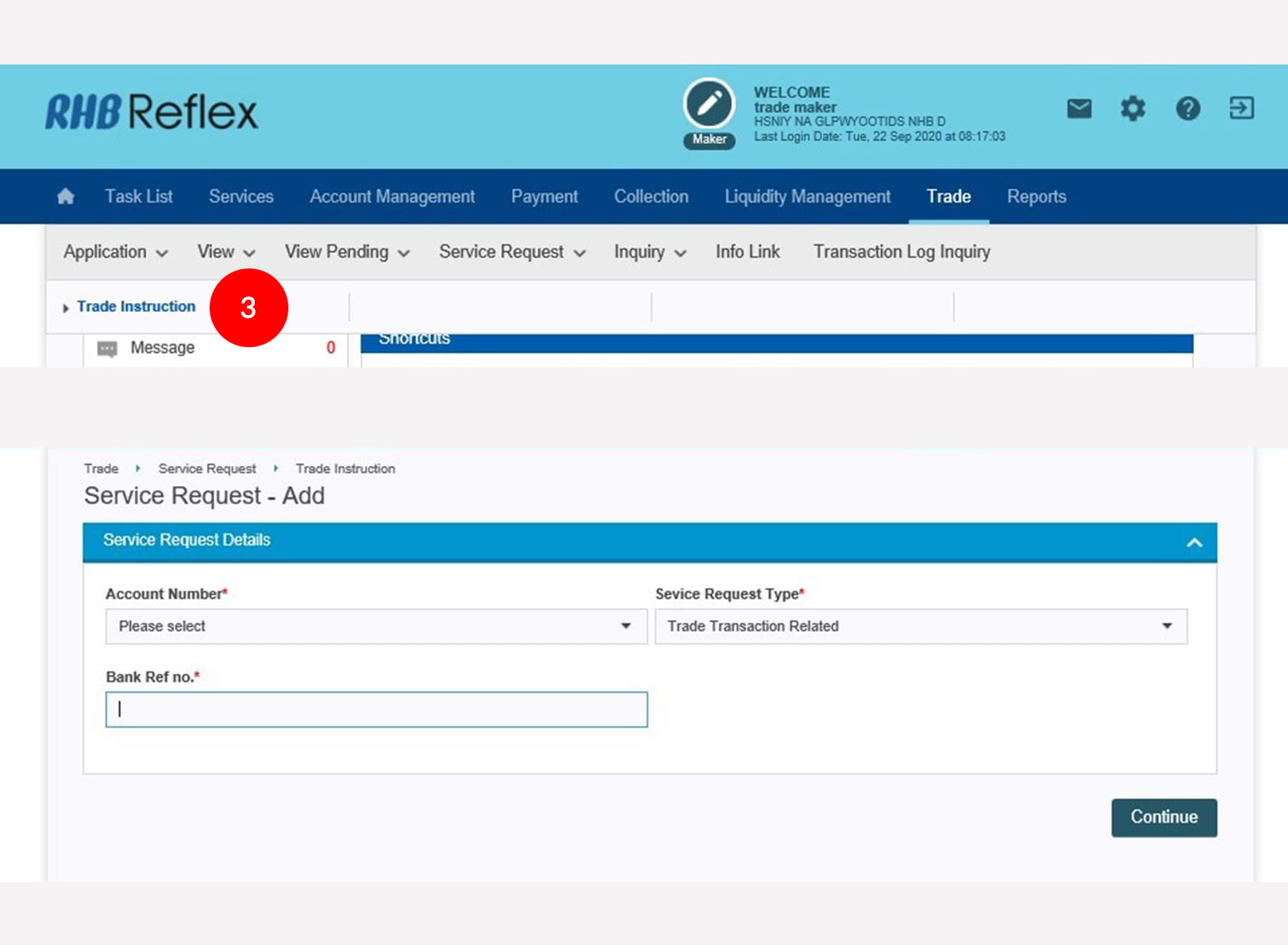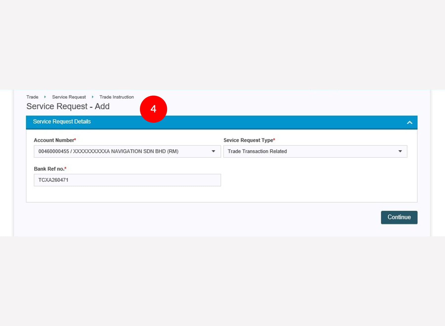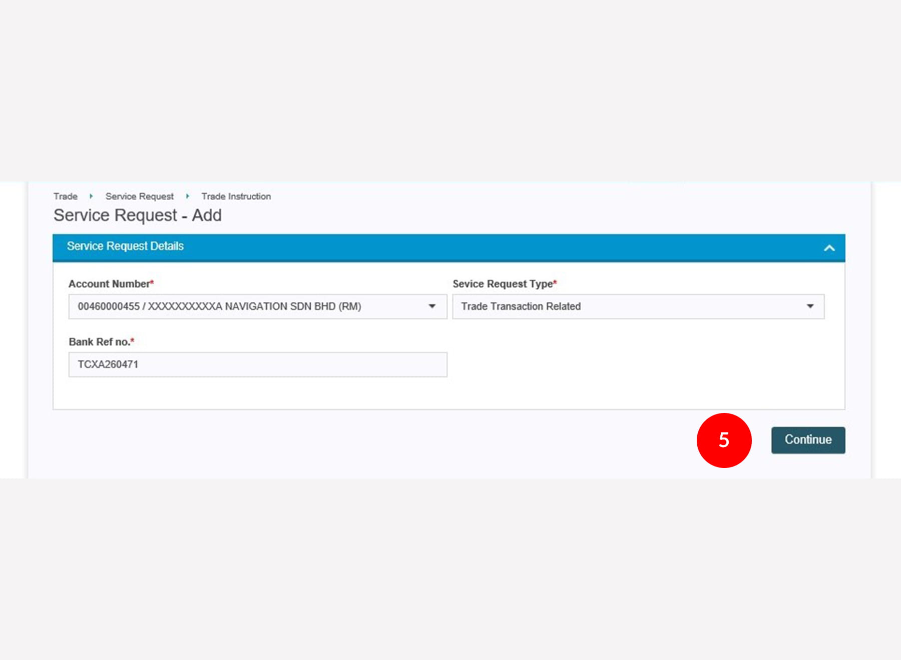 4.Select the Trade Account Number, Service Request Type from the drop down list and key in the Trade Transaction Bank Reference No.