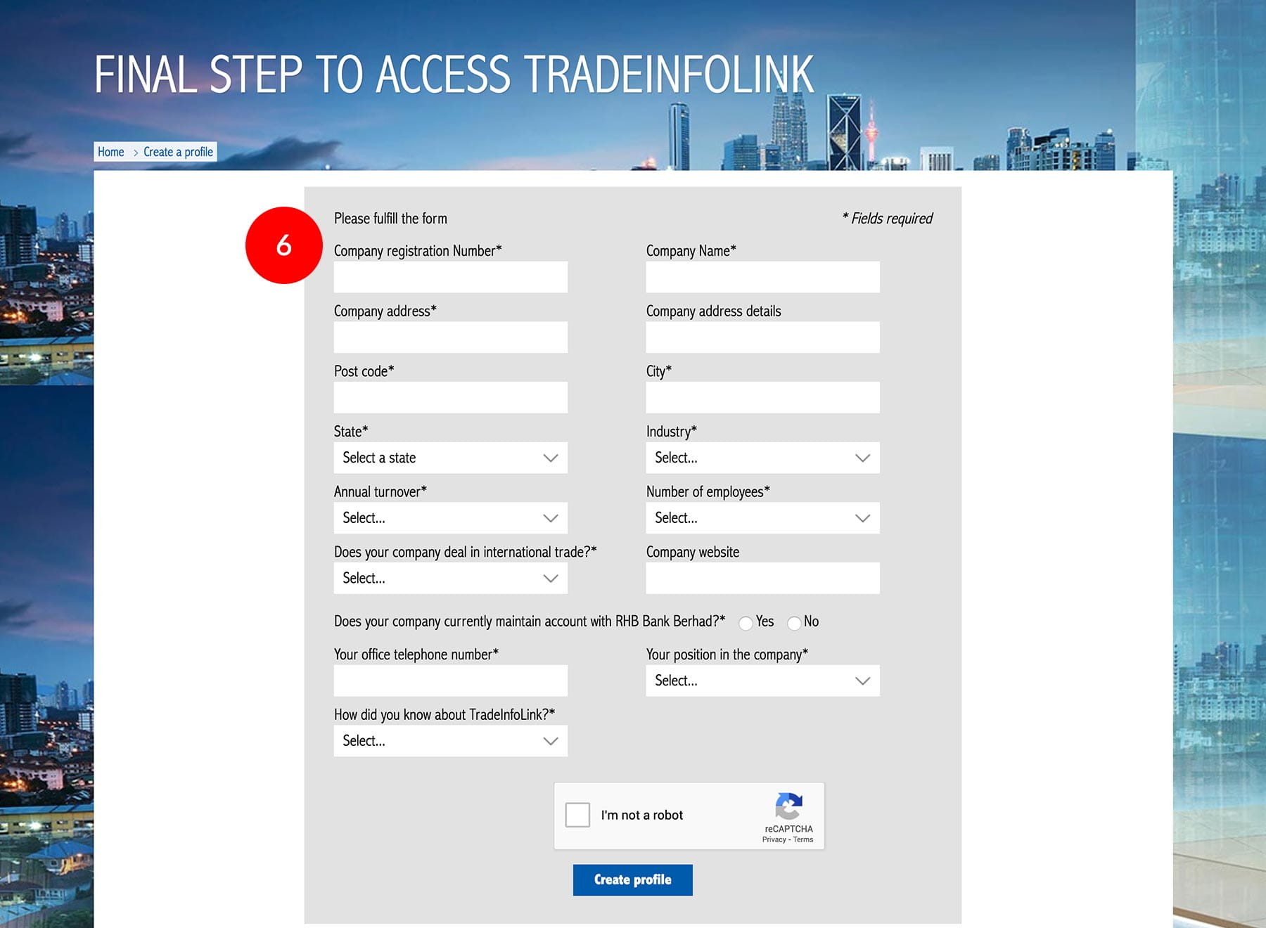 2.You will be directed to Trade Info Link. Choose “Create a Profile”