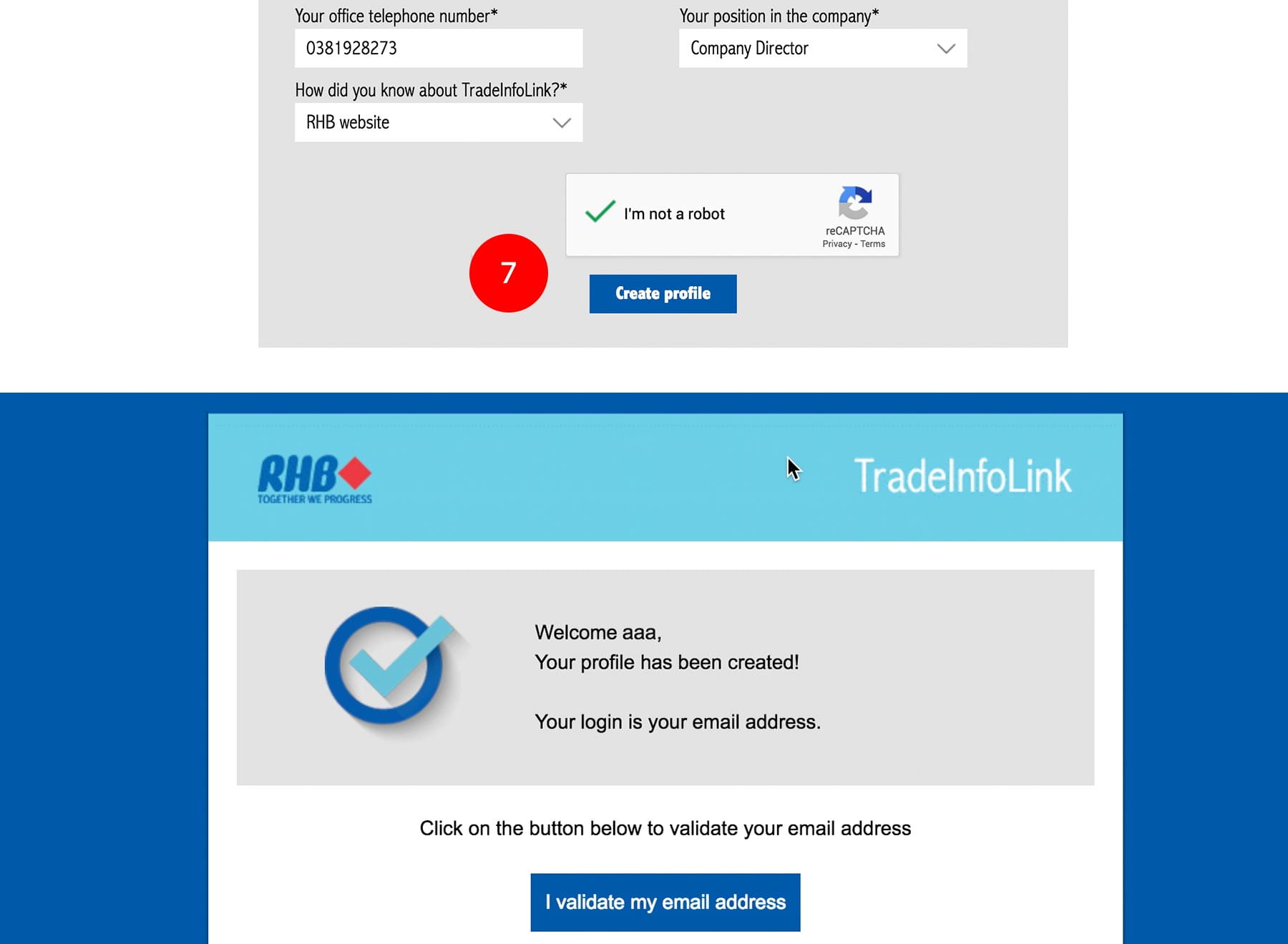 Please click on the link in the confirmation email to validate your email address. You will be redirected to Tradeinfolink website with confirmation of email validation.