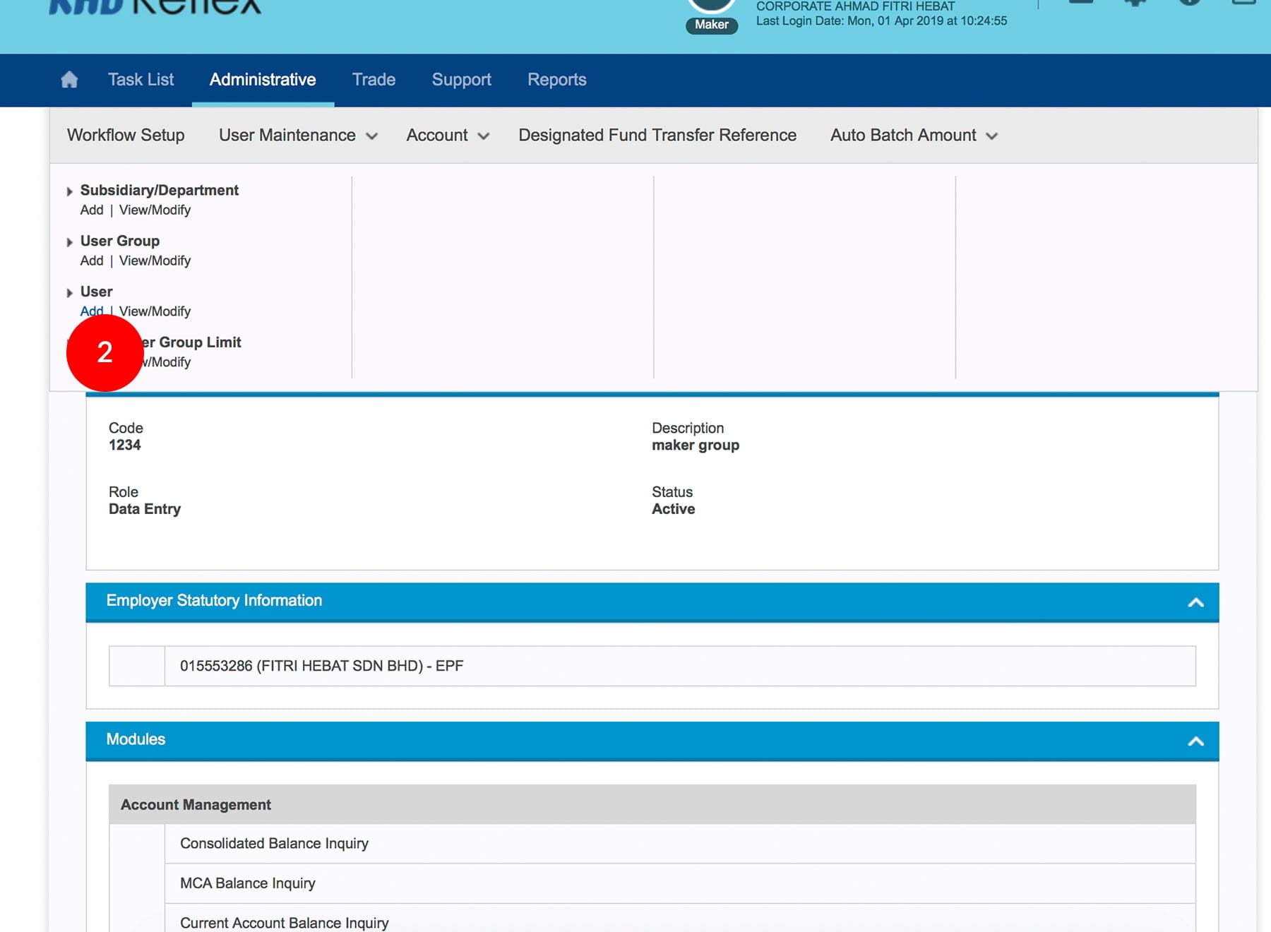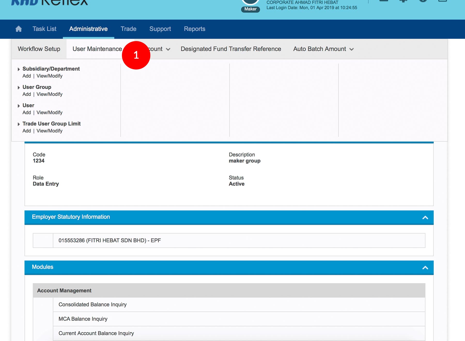 1.Login as Sysadmin1 and under the “Administrative” tab; select “User Maintenance” tab