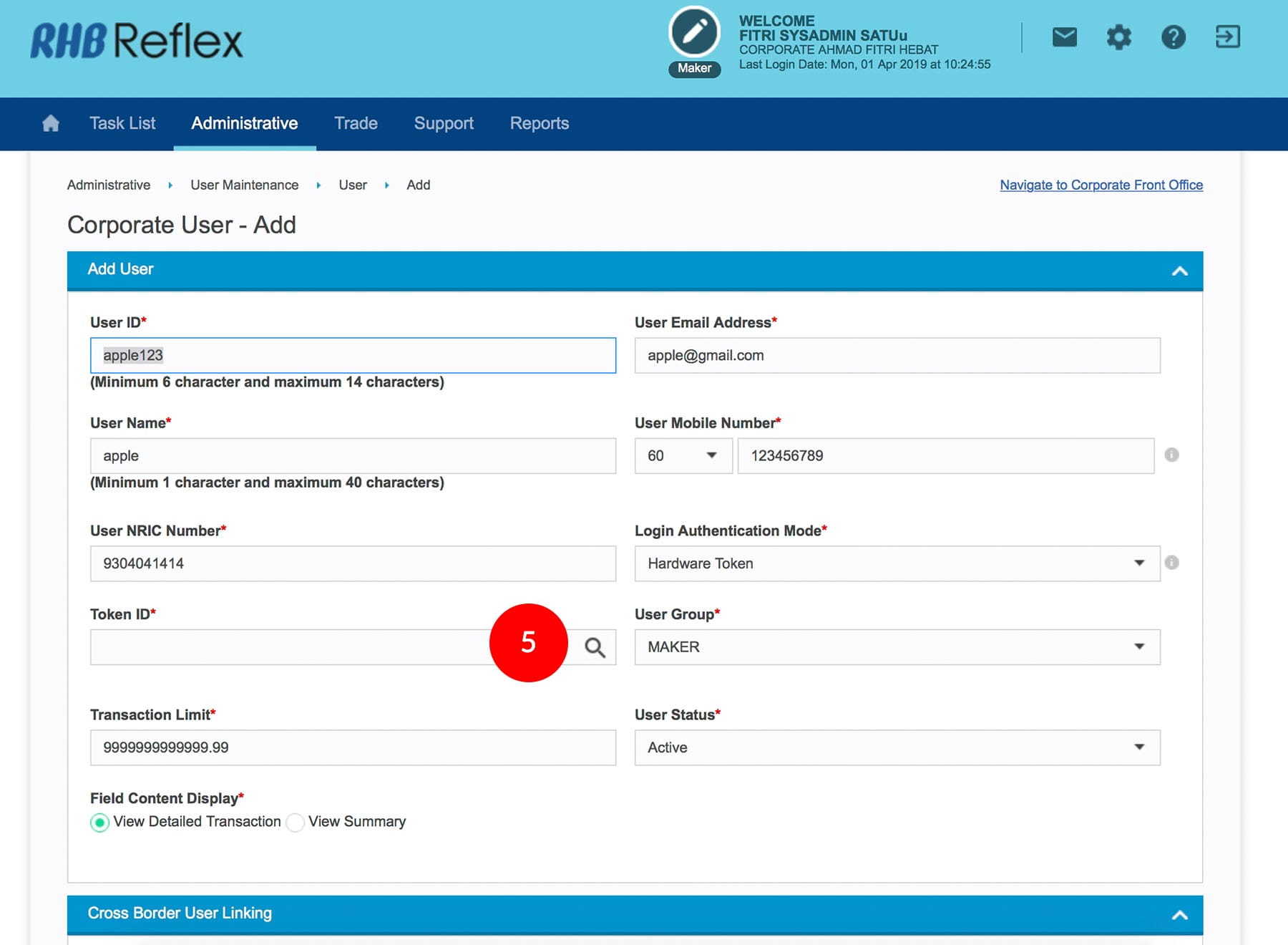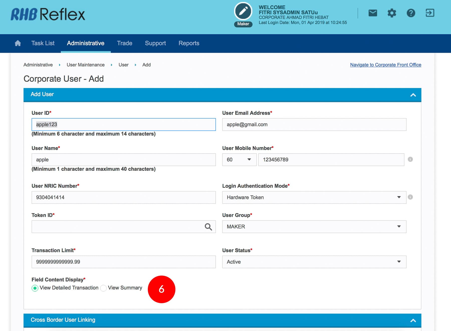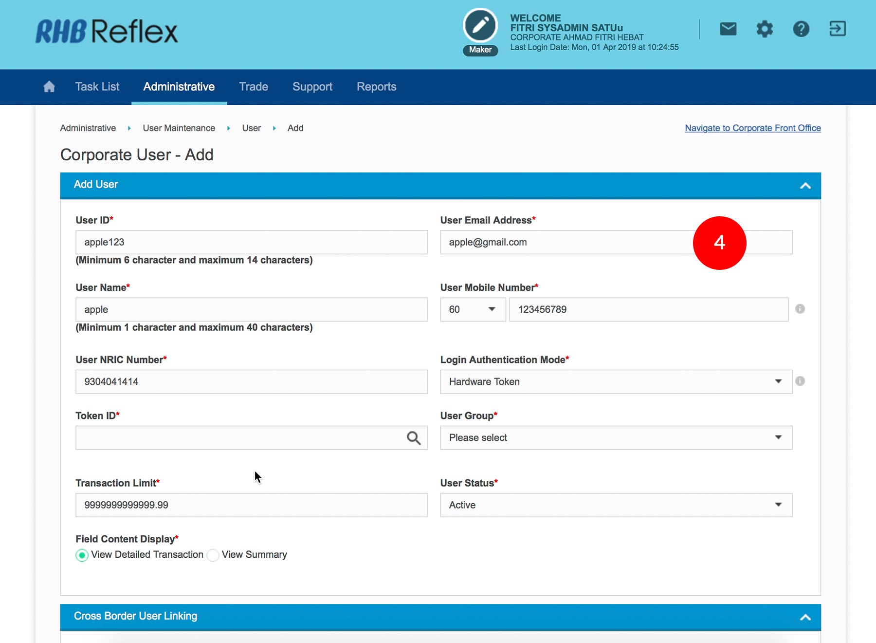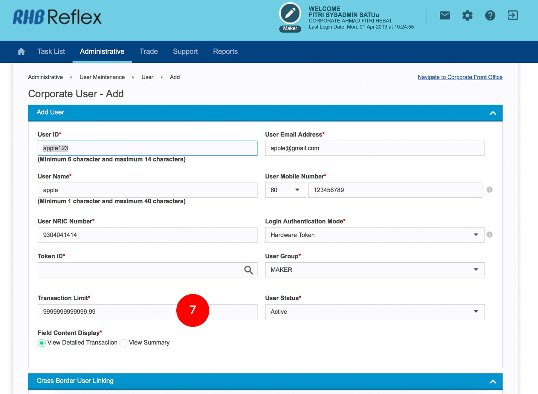 7.Enter the Transaction Limit (For Data Entry/Reviewer/Authorizer).