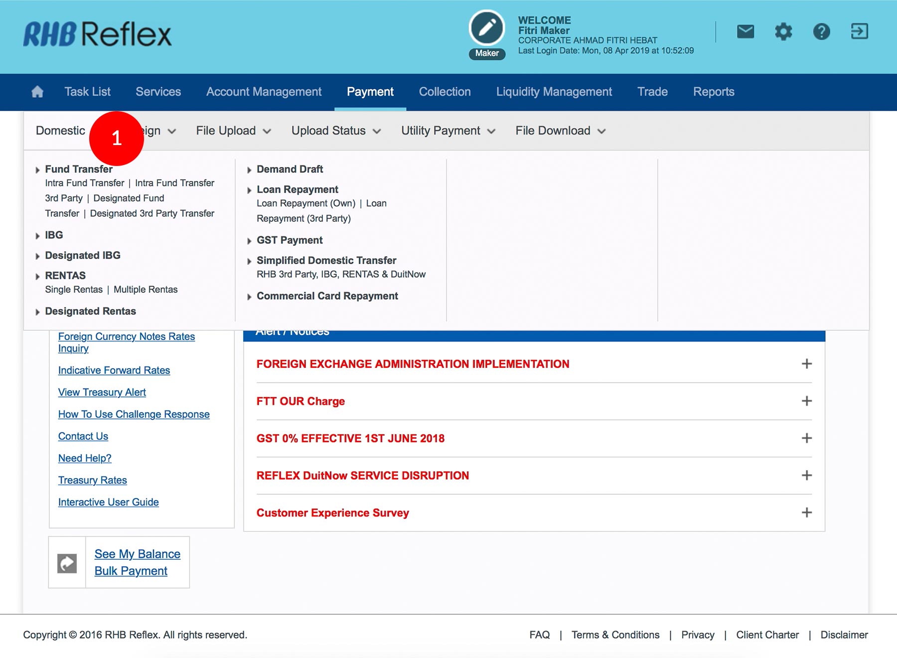 1.Login as Data Entry and under “Payment” tab; select “Domestic”.